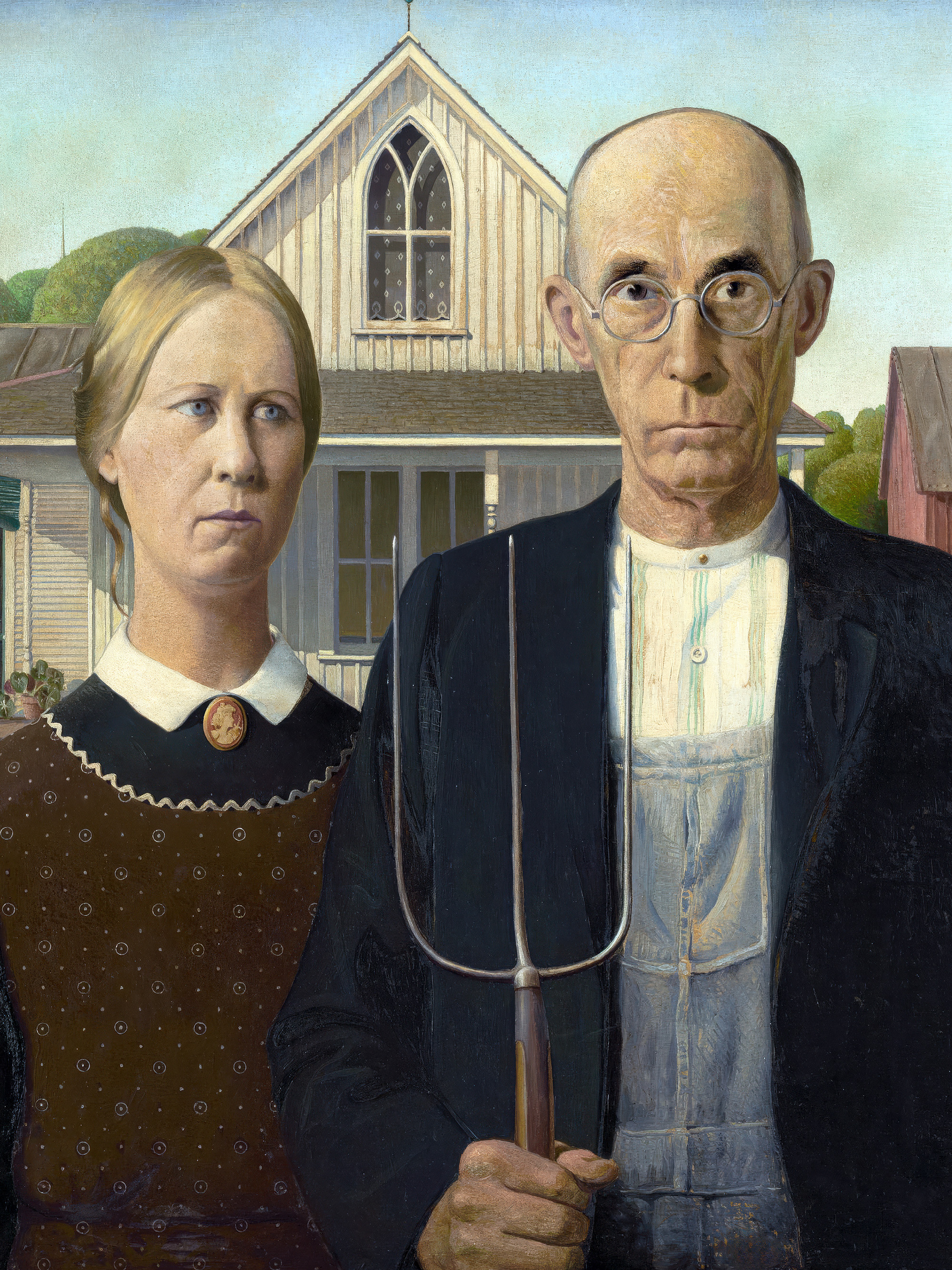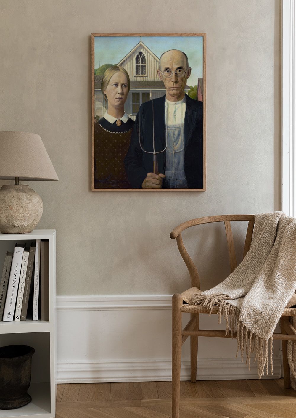 A print of Grant Wood's famous American Gothic painting. A man holding a pitchfork and a woman stand in front of a house with a pointed window. Perfect wall art for art lovers.