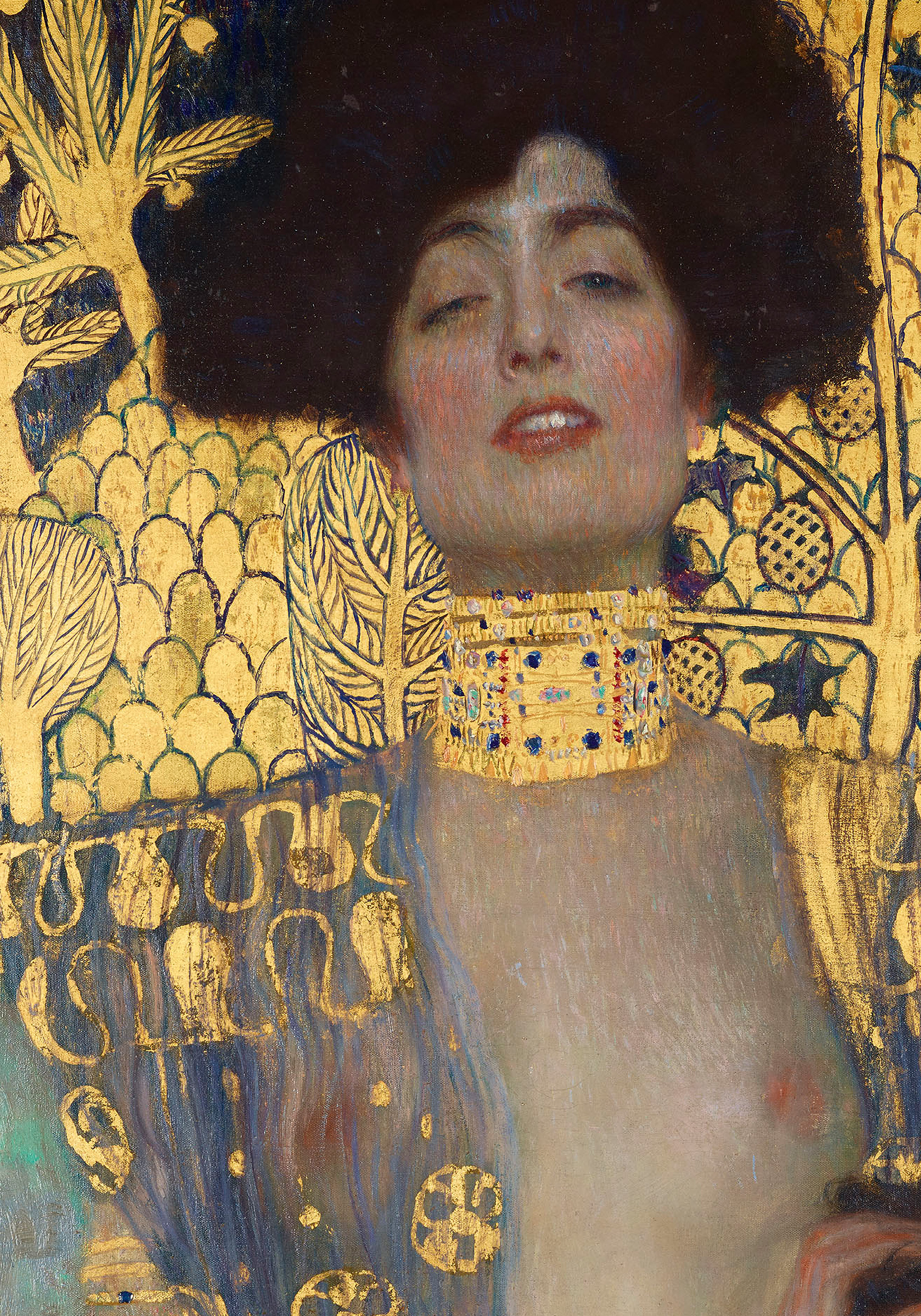 From $15.57A print of a person with dark curly hair wearing an ornate gold choker. The art features intricate patterns with gold, blue, and red colours. A beautiful wall art piece inspired by Gustav Klimt's decorative style.