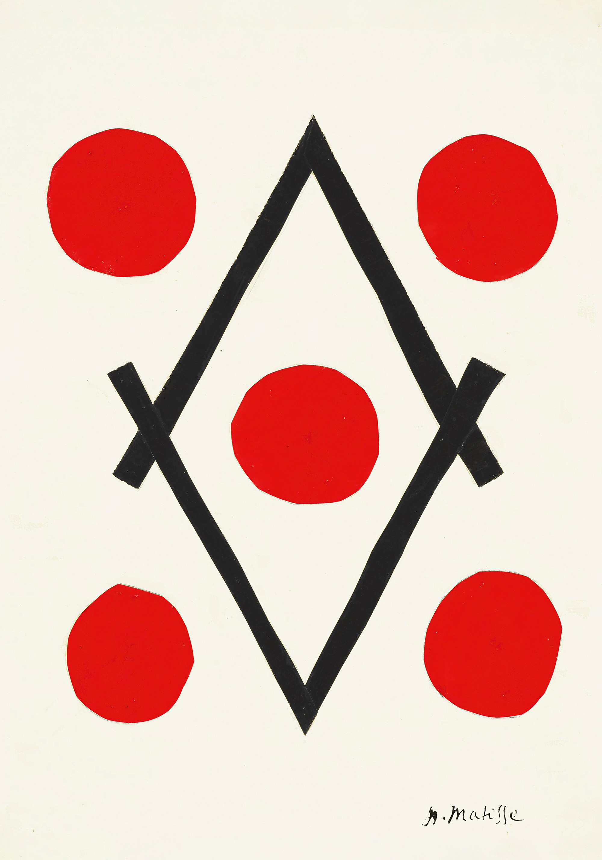 A print inspired by Henri Matisse, featuring five red circles on a white background with bold black lines forming a diamond shape.