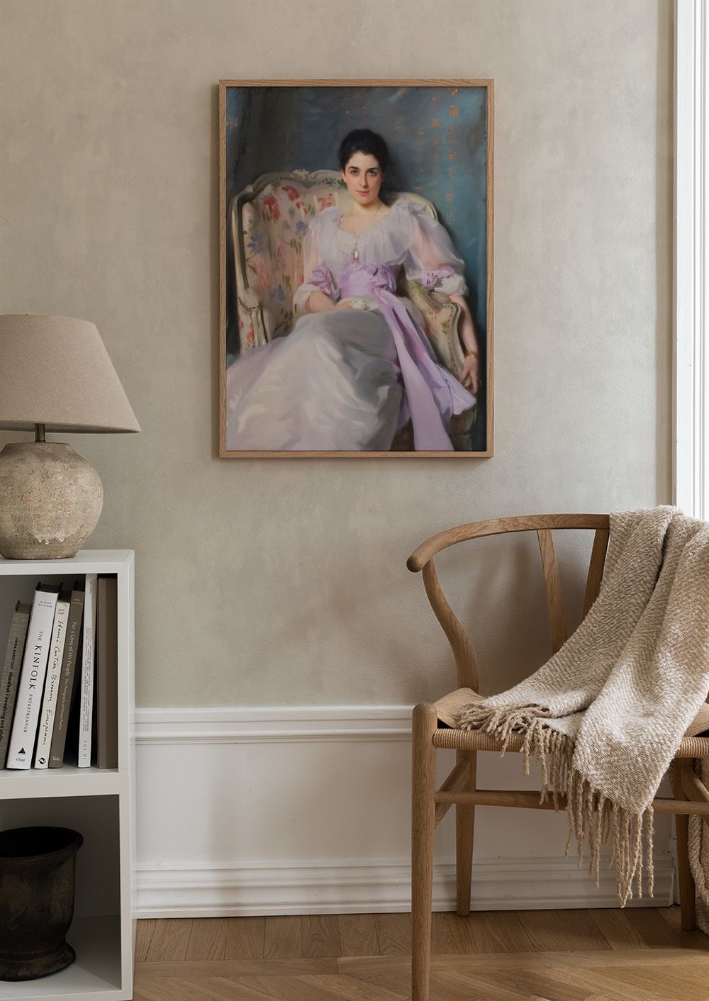 A print of a woman in a light purple dress sitting on a floral-patterned chair against a blue background. Elegant wall art with soft, pastel colours.