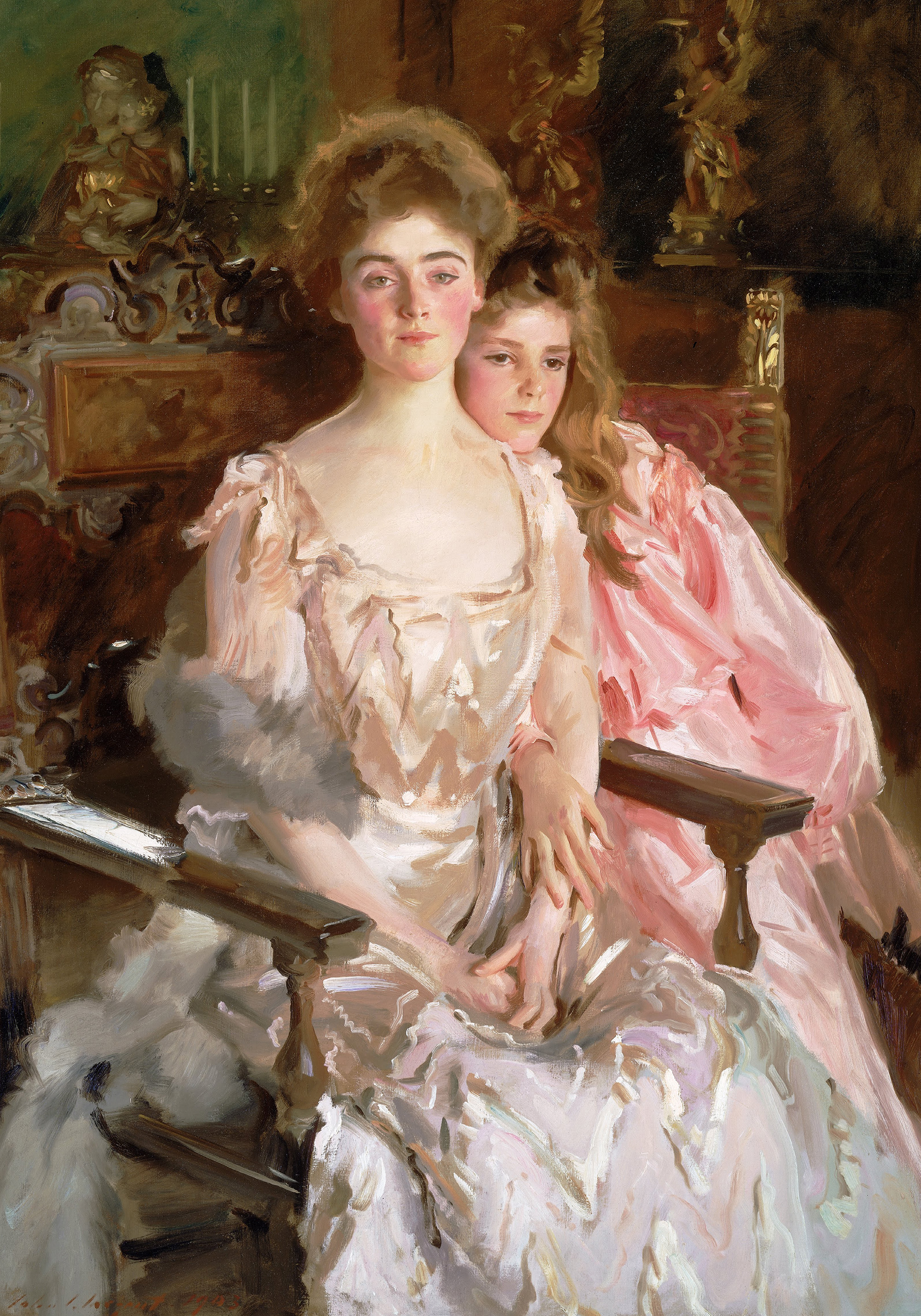 From $15.57A print of two women sitting together on an ornate wooden chair. One woman wears an elegant white dress with ruffled sleeves, whilst the other wears a pink dress. The background is dark with hints of green and gold.