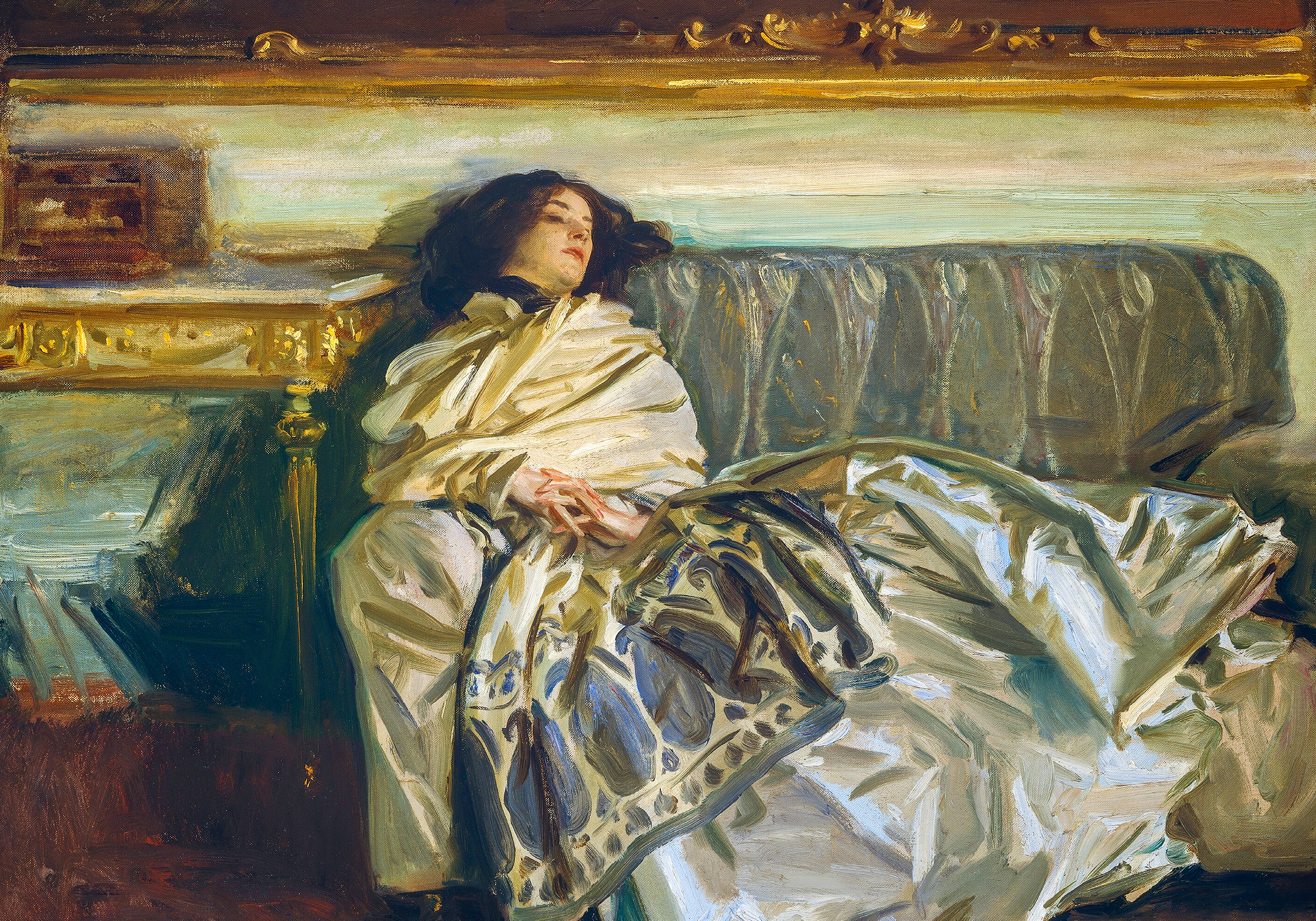 A print of a person with dark hair wrapped in a light-coloured fabric with dark patterns, lying on a greyish-blue sofa. Soft and relaxed wall art with warm and cool tones.