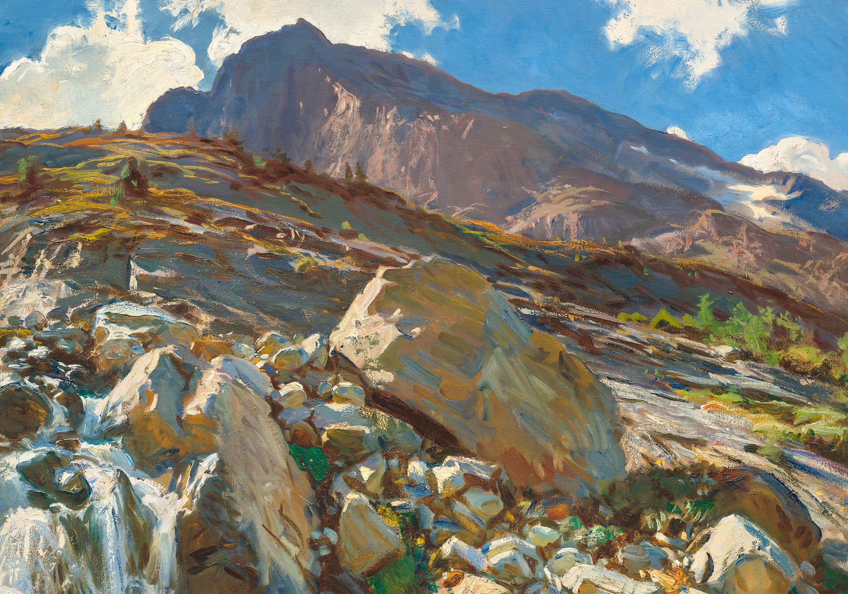 A print of a rocky landscape with stones scattered around and a large mountain in the background under a bright blue sky with white clouds.