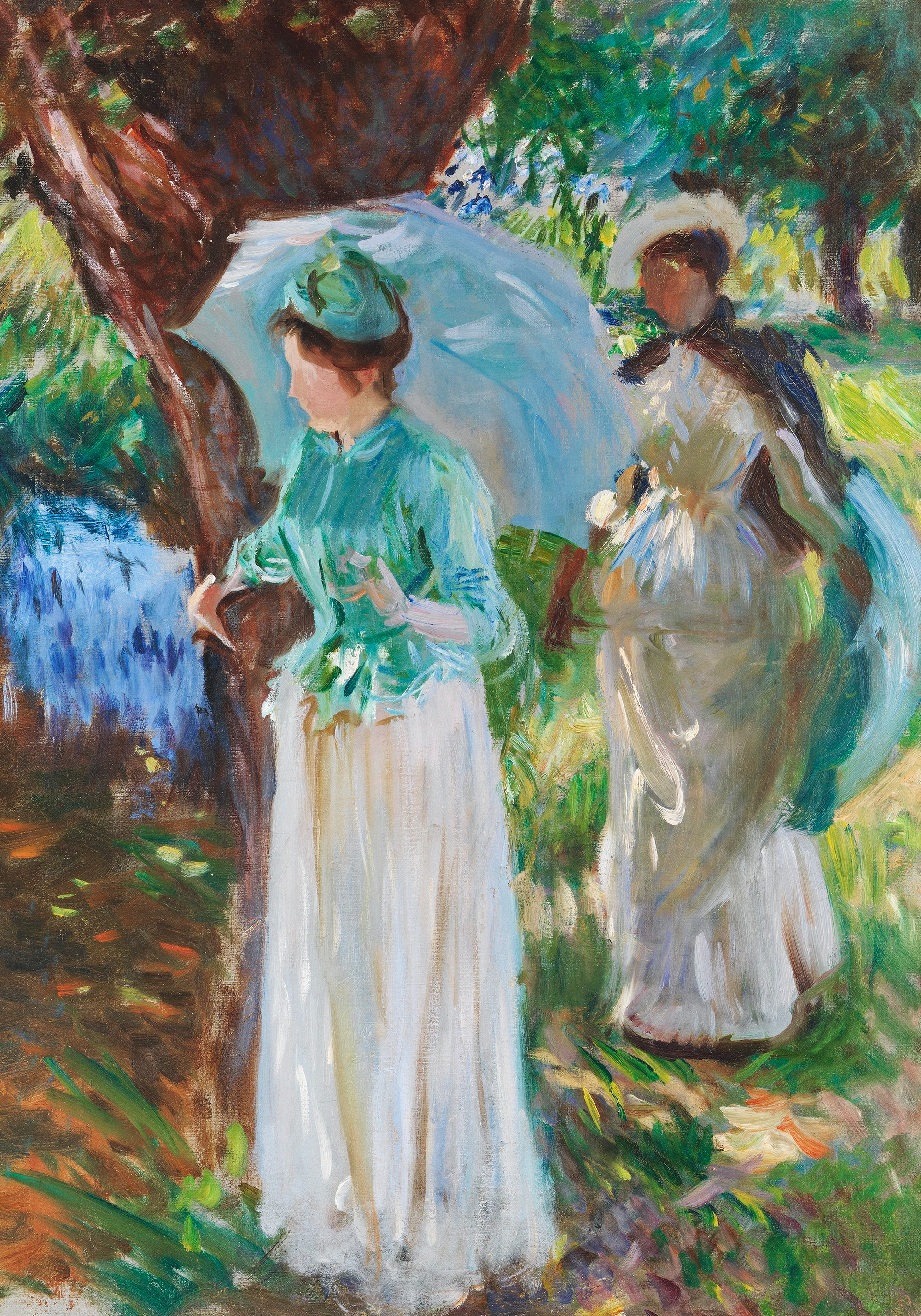 A print of two women in a garden, one wearing a green top and white skirt holding a white parasol, the other in a white dress and hat. Perfect wall art for your home.