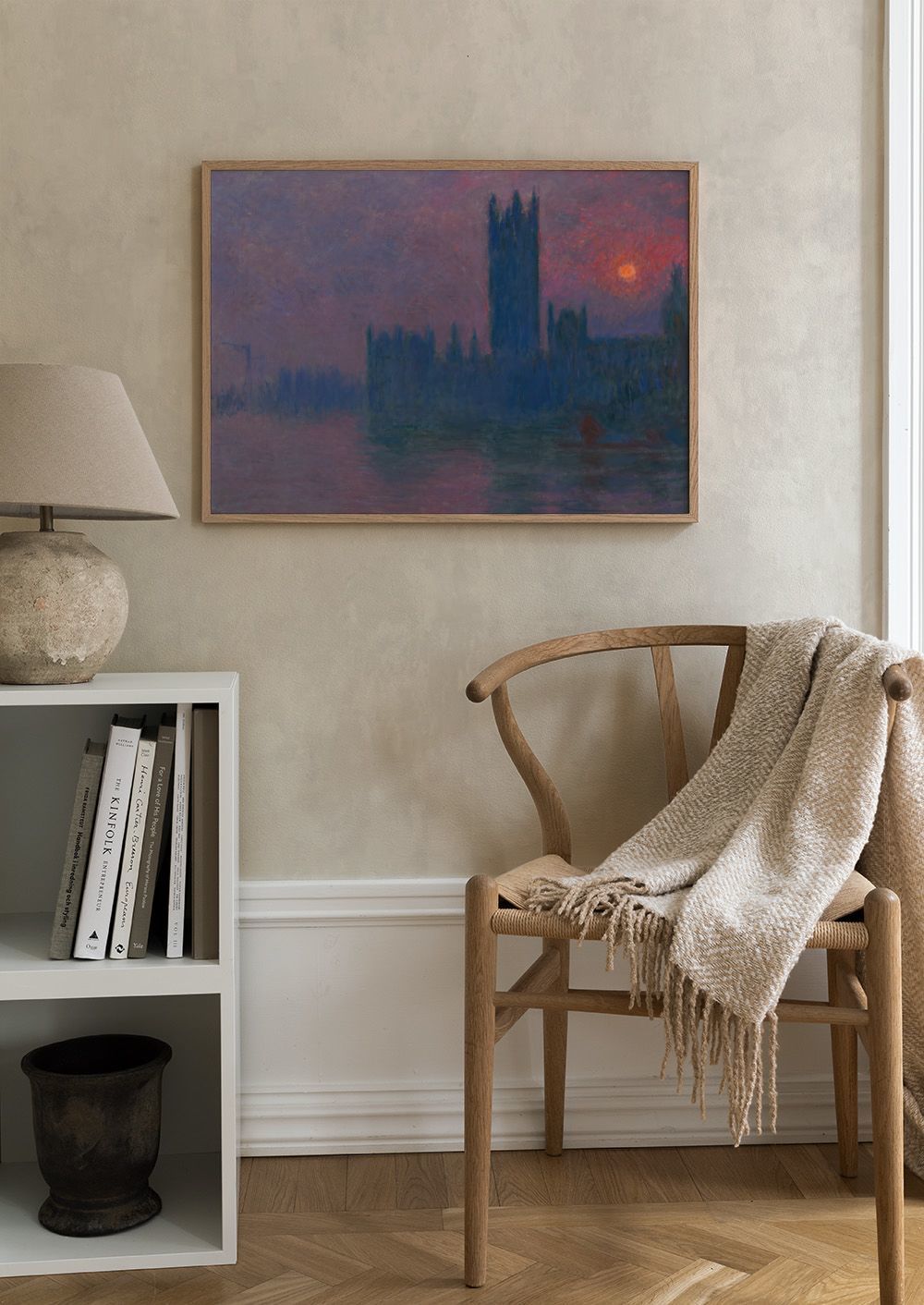 A print of a large building with tall spires against a colourful sky in pink, purple, and orange. The water in the foreground reflects the beautiful colours of the sky.