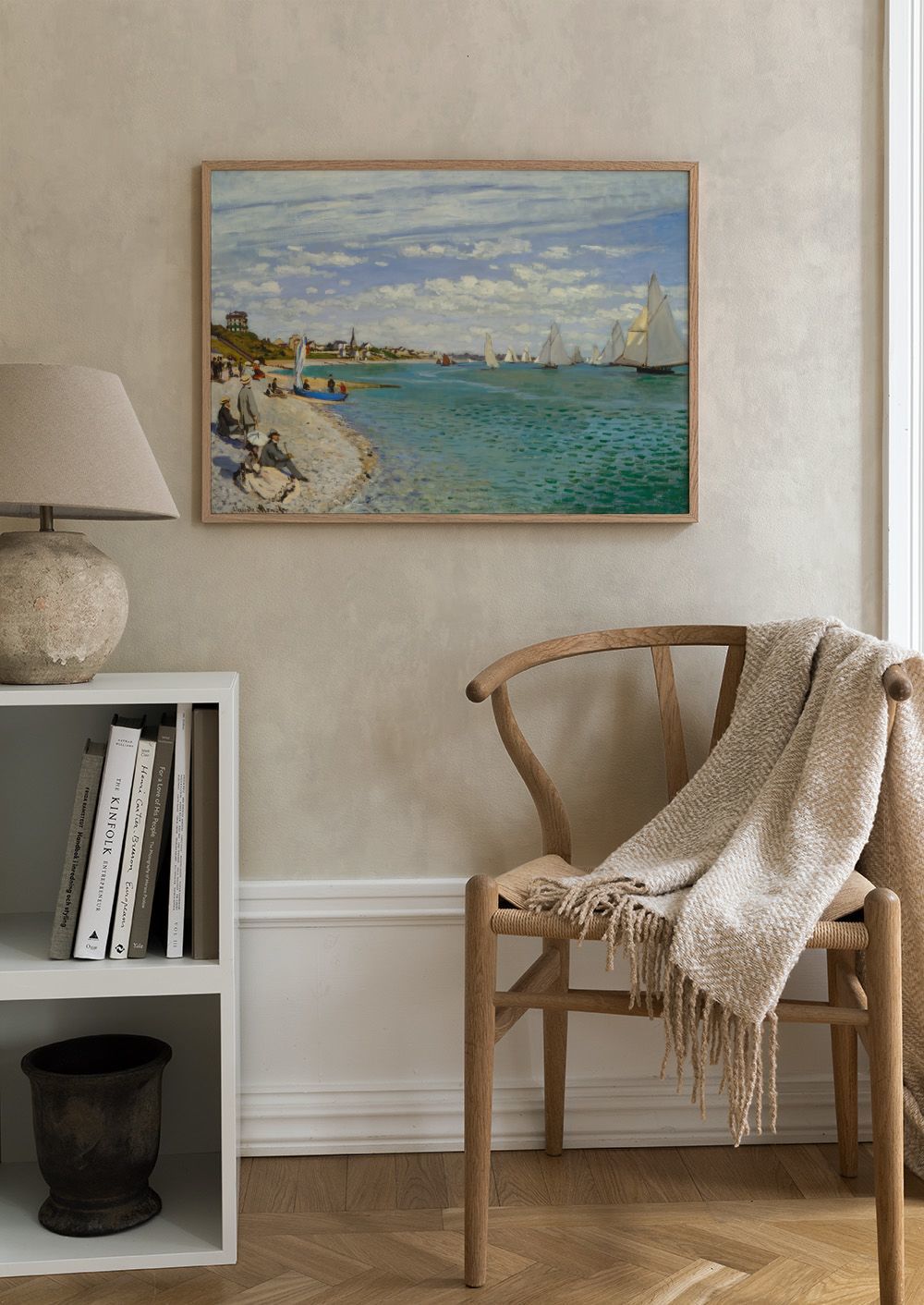 A print of a beach scene with people on the shore and sailboats on the green-blue sea. The sky is light blue with white clouds, and buildings can be seen in the distance.