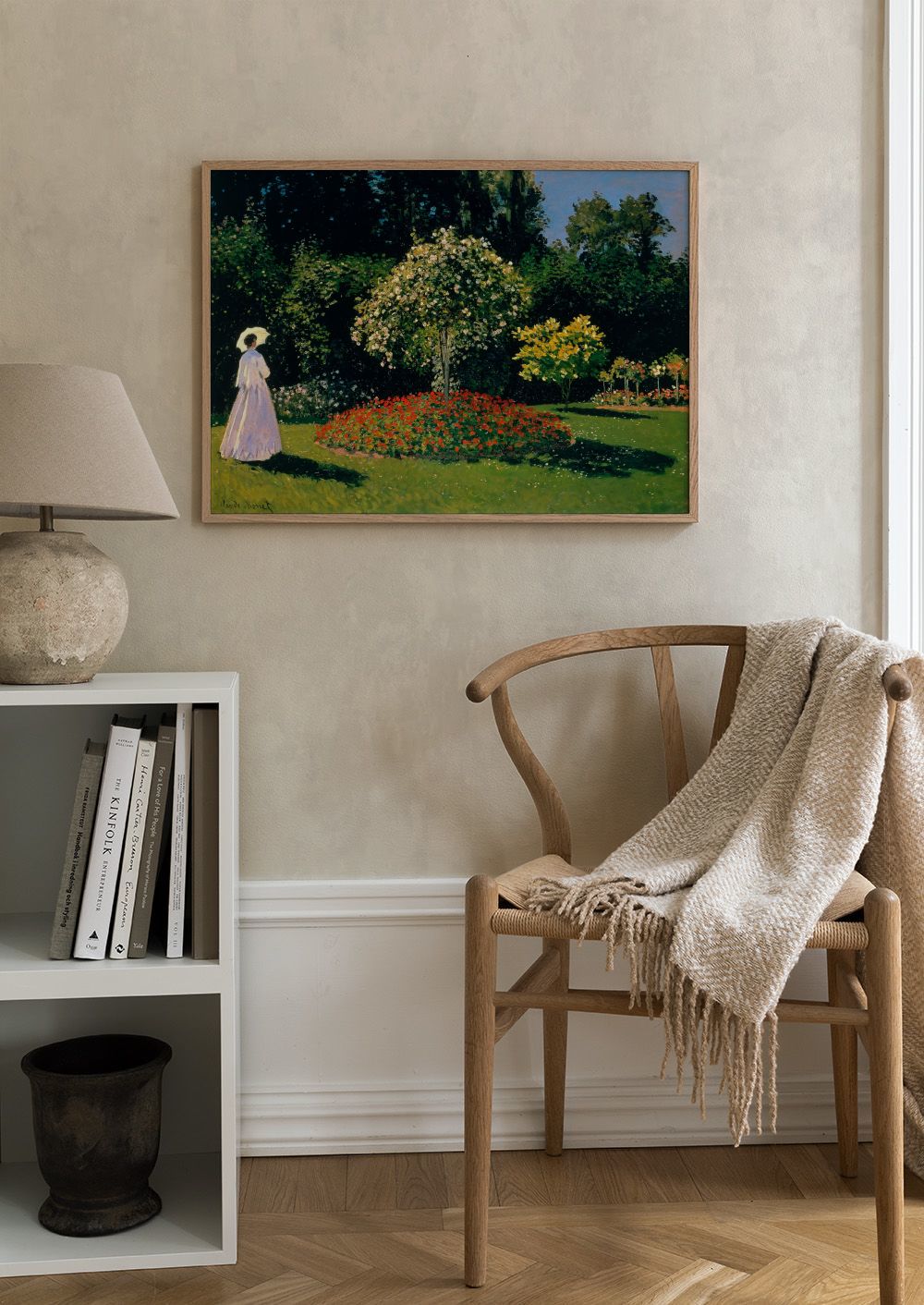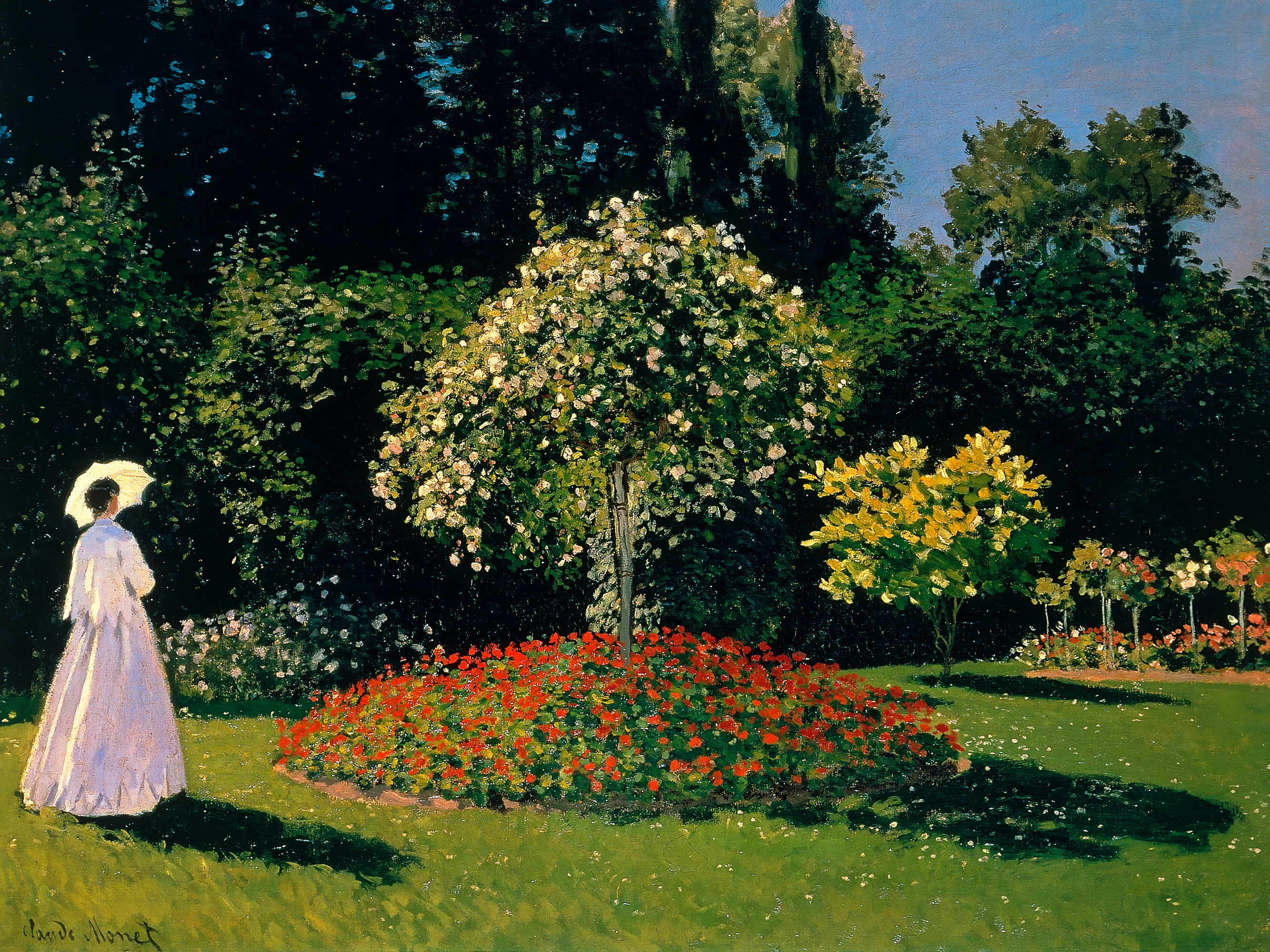From $15.57A print of a woman in a white dress holding a parasol in a garden. The garden features red and yellow flowers, green grass, and a tree with white flowers. Perfect wall art for your home.