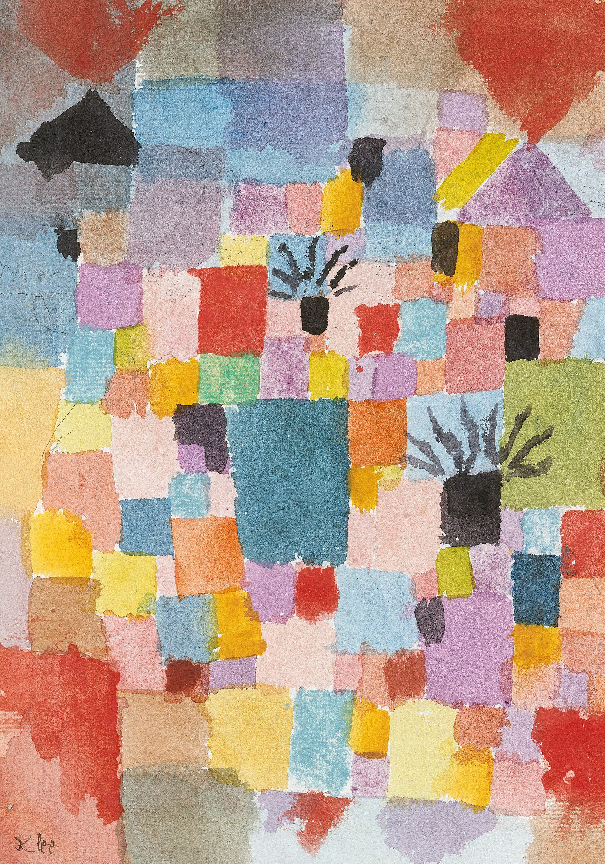 A vibrant print featuring colourful squares and rectangles in red, blue, yellow, pink, orange, and green with small black plant-like shapes.