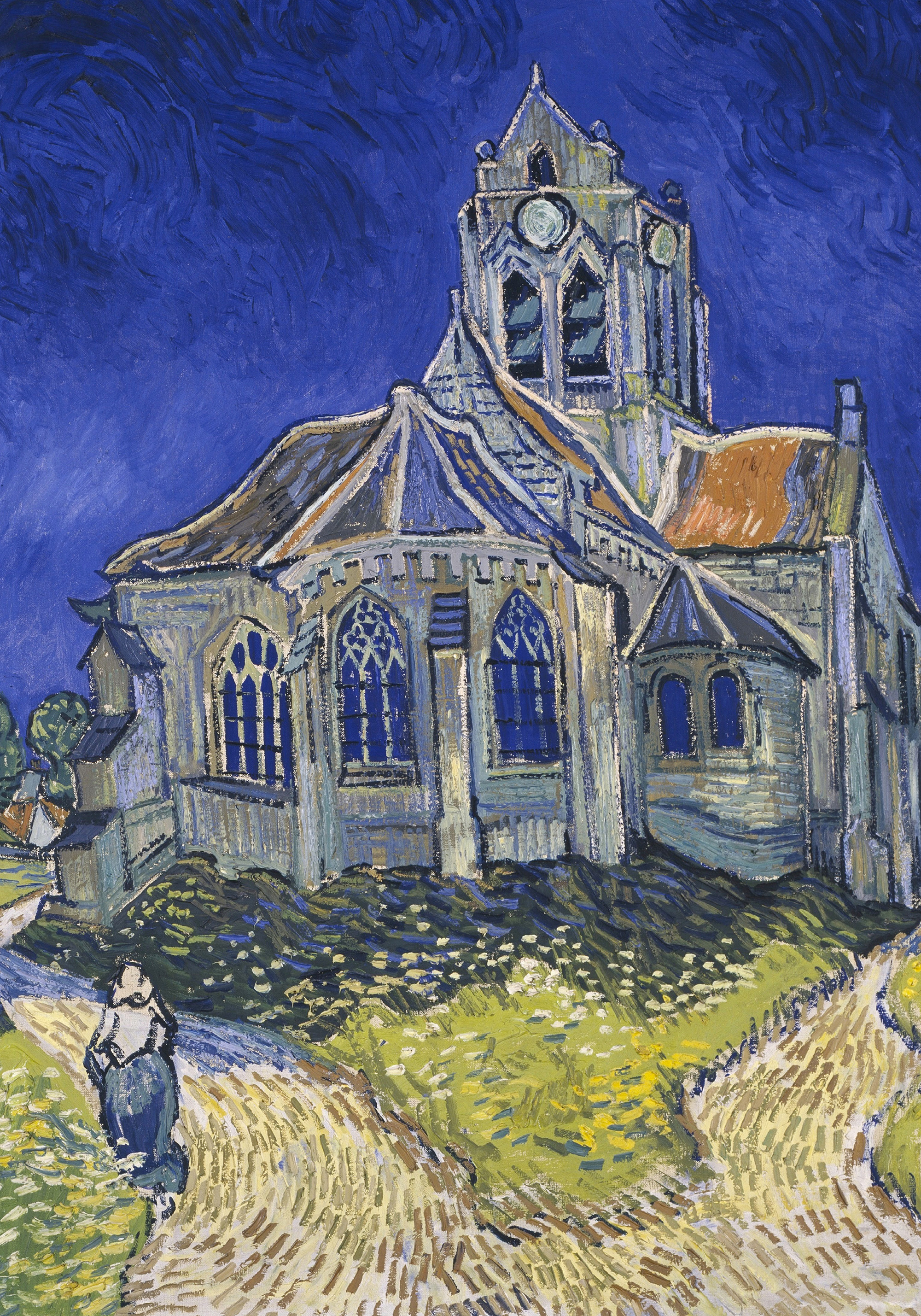 A print of a church with pointed roofs and arched windows against a deep blue sky. A woman in a blue dress walks on a path surrounded by green grass and yellow flowers.