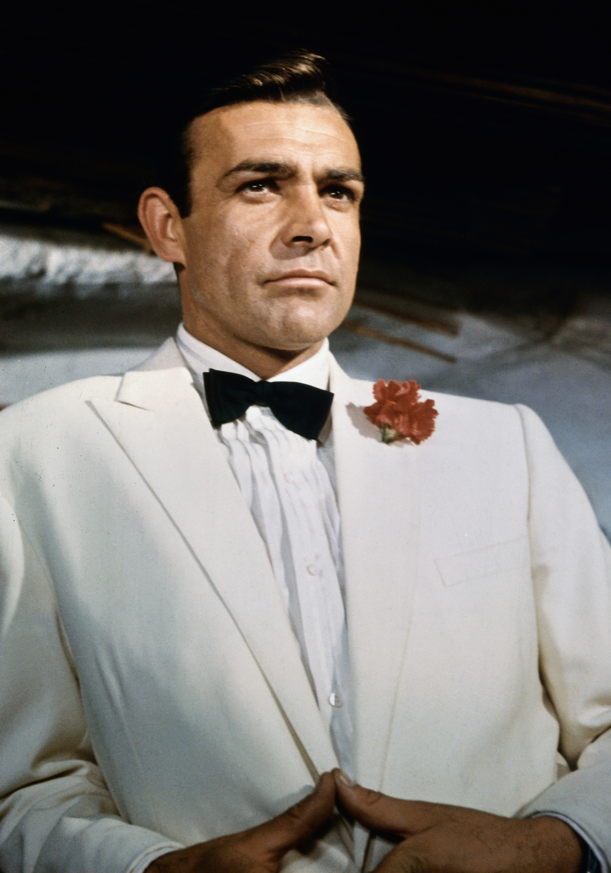 A print of a man wearing a white tuxedo with a black bow tie and a red flower on his jacket.