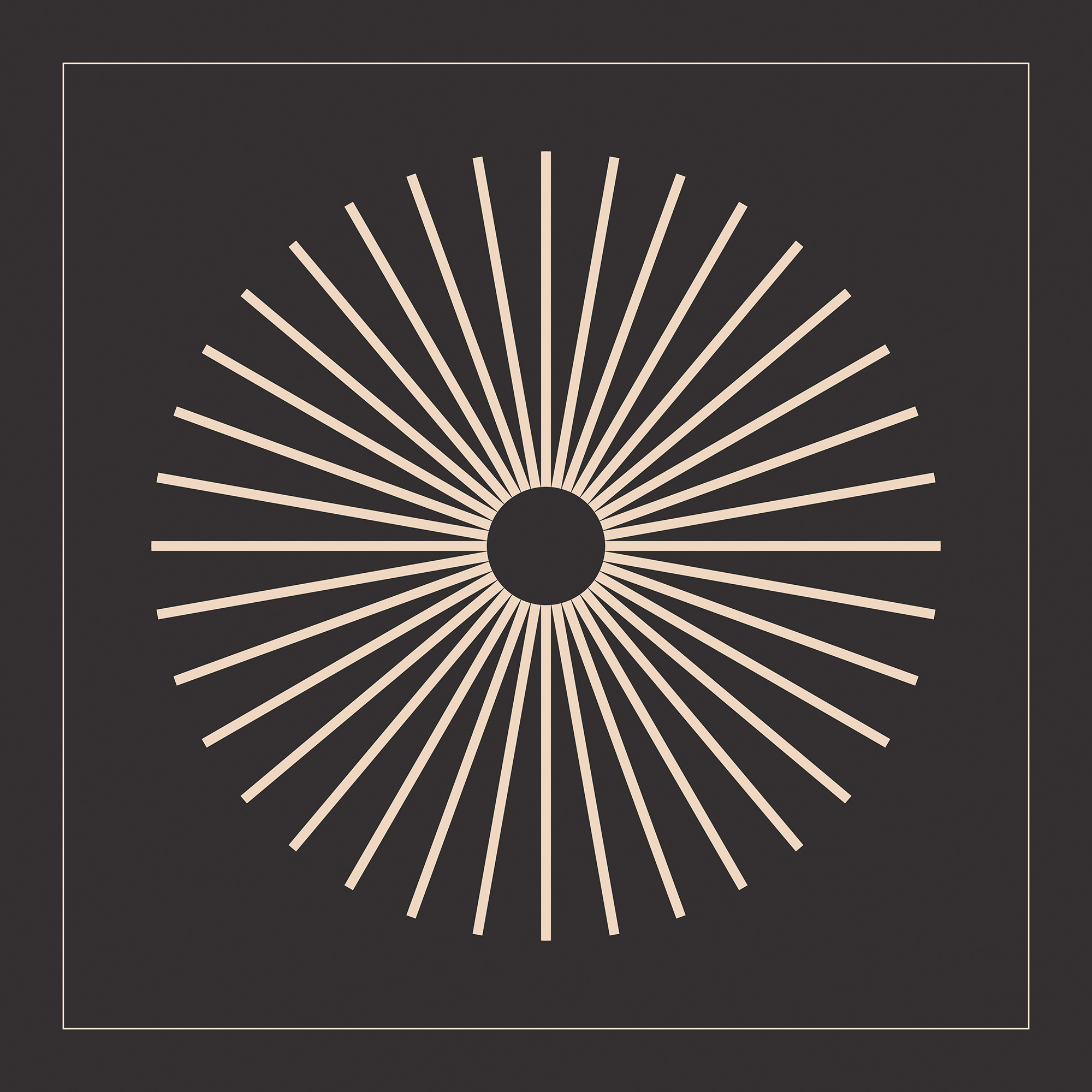 A print with a geometric sunburst design in beige on a black background. The radial pattern features straight lines spreading from a central circle, creating a symmetrical and modern look.