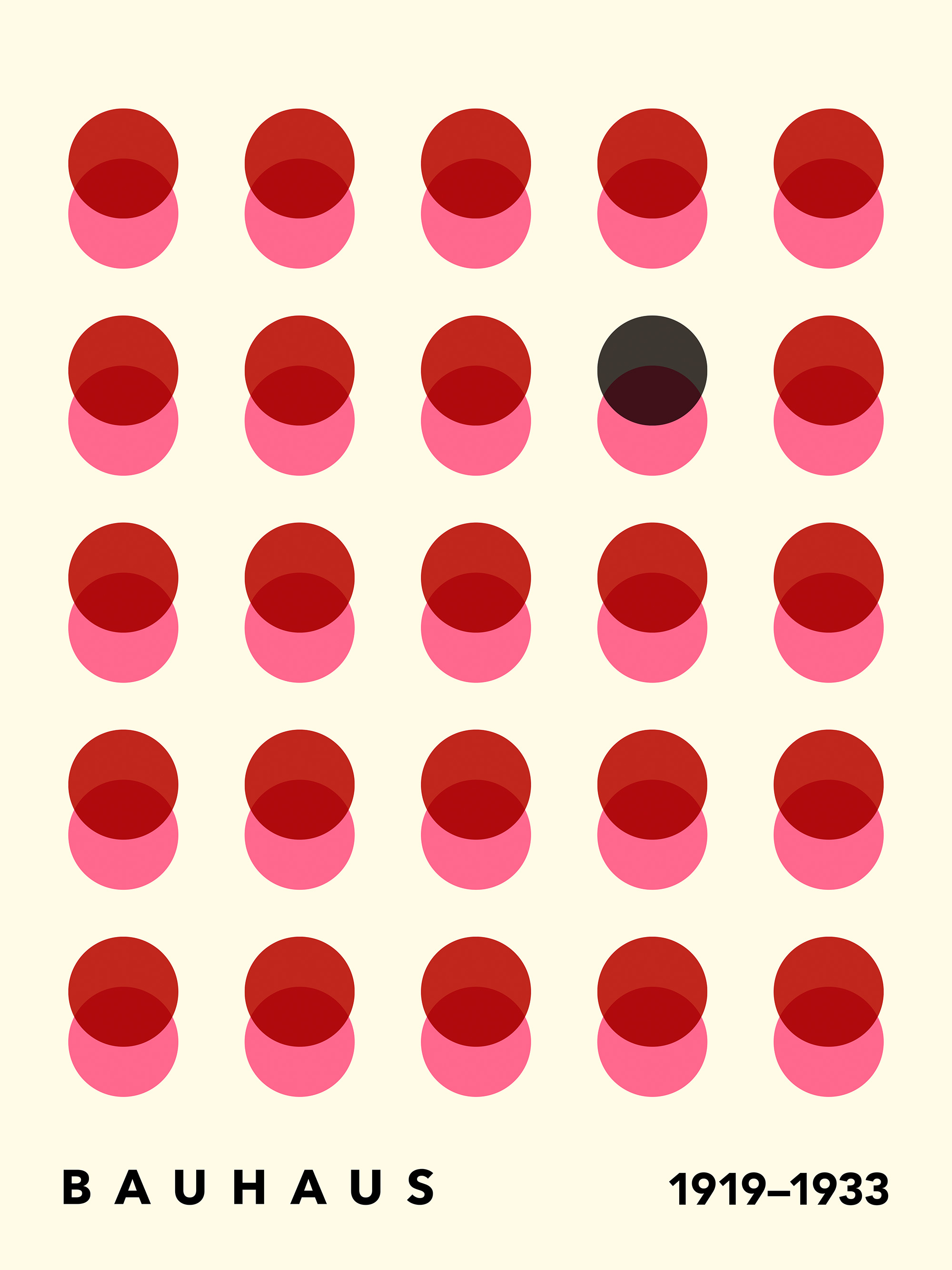 From $15.57A print featuring 25 circles in a 5x5 grid with red and pink colours on a light beige background. Bauhaus-inspired design with the text "BAUHAUS 1919–1933" at the bottom.