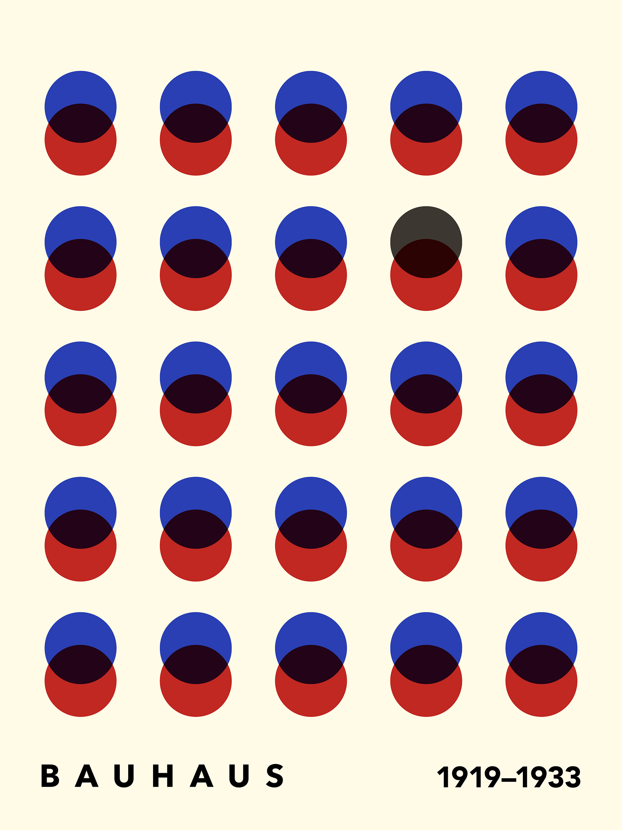 From $15.57A print featuring a grid of circles in blue and red on a light background. The overlapping colours create a dark purple centre. Bauhaus-inspired wall art with bold geometric shapes.