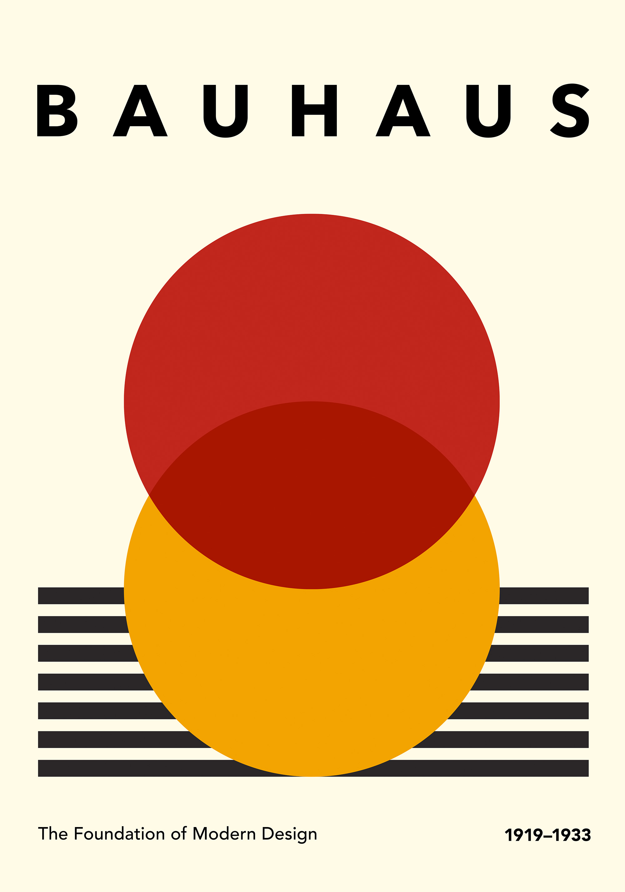 From $15.57A print with the word "BAUHAUS" in bold black letters, red and orange overlapping circles, and black horizontal stripes on a beige background.