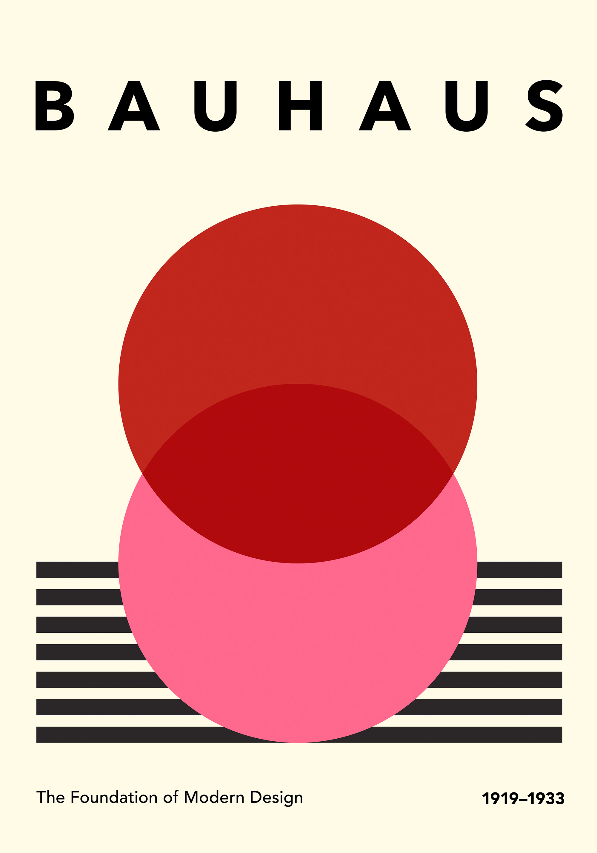 A print with red and pink circles and black stripes on a white background. Perfect wall art for fans of Bauhaus design.