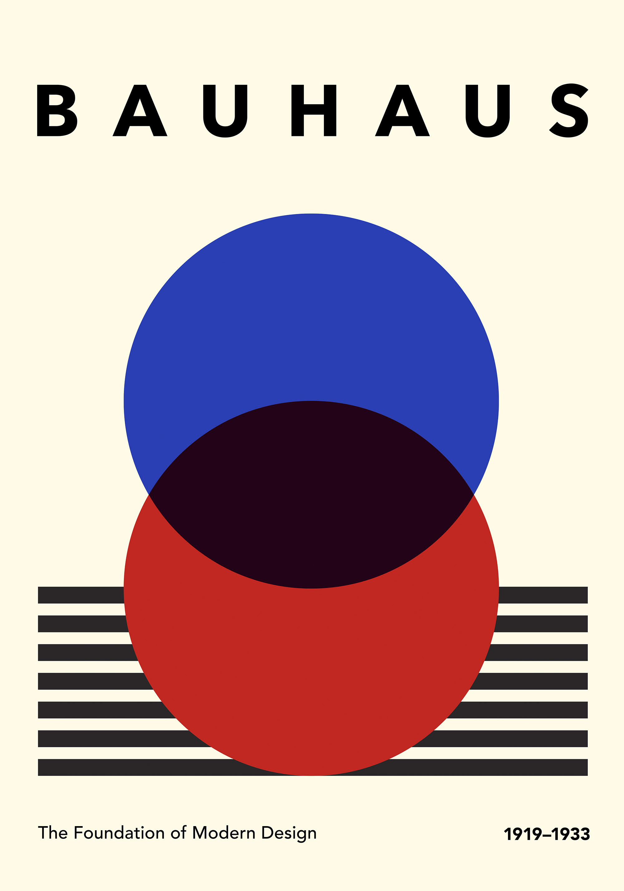 From $15.57A print with the text "BAUHAUS" at the top, featuring a blue and red circle with black stripes below. Simple geometric design in bold colours.