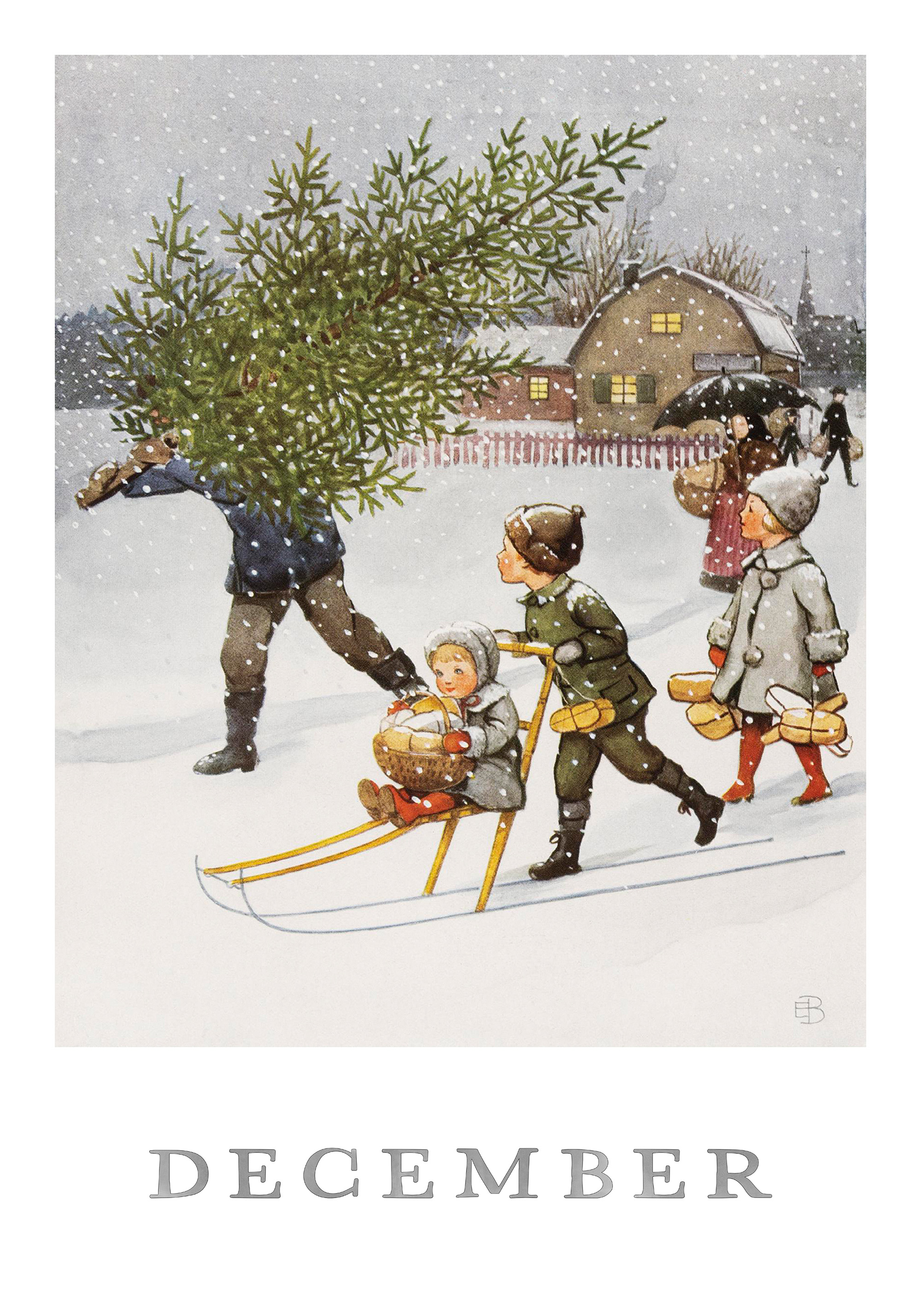 A winter print showing children playing in the snow with a Christmas tree, sled, and gifts. A cosy house with a snowy roof and chimney is in the background.