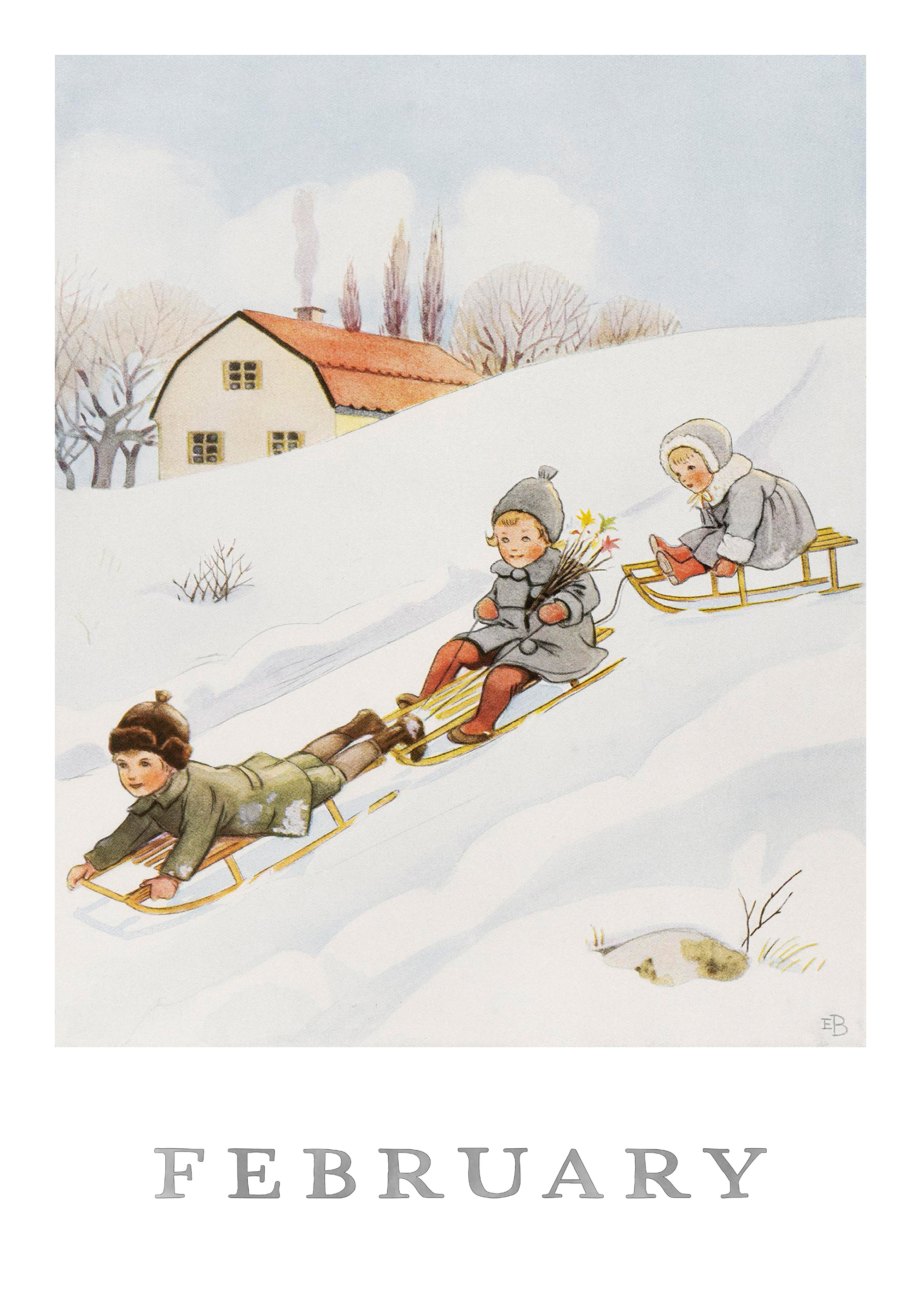 From $15.57A print illustrating three children sledding on a snowy hill. One child lies on a sled, another holds flowers and branches, and the third sits on a sled. A house with a red roof and bare trees are in the background against a light blue sky.