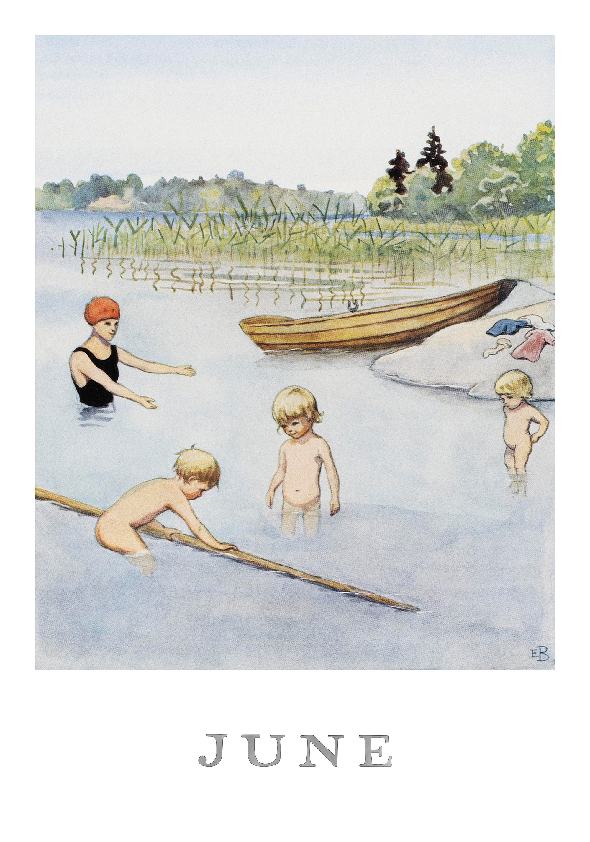 A charming print of children playing by a lake in June. One child wears an orange cap in the water whilst others play nearby. Perfect wall art for a playful touch.