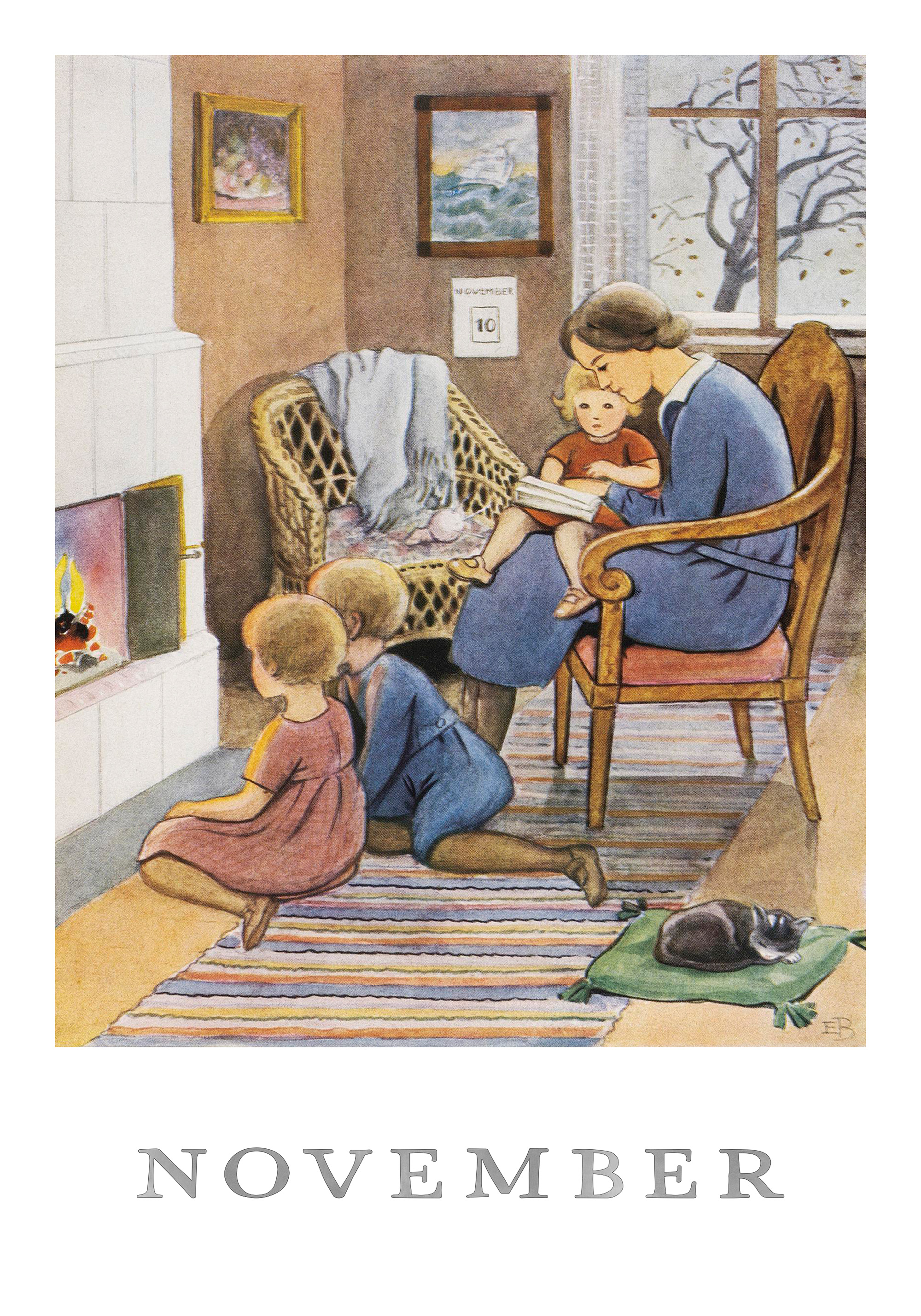 A print illustrating a cosy November scene with a mother reading to children by the fireplace. A cat sleeps peacefully on a green cushion while the children sit on a striped rug.