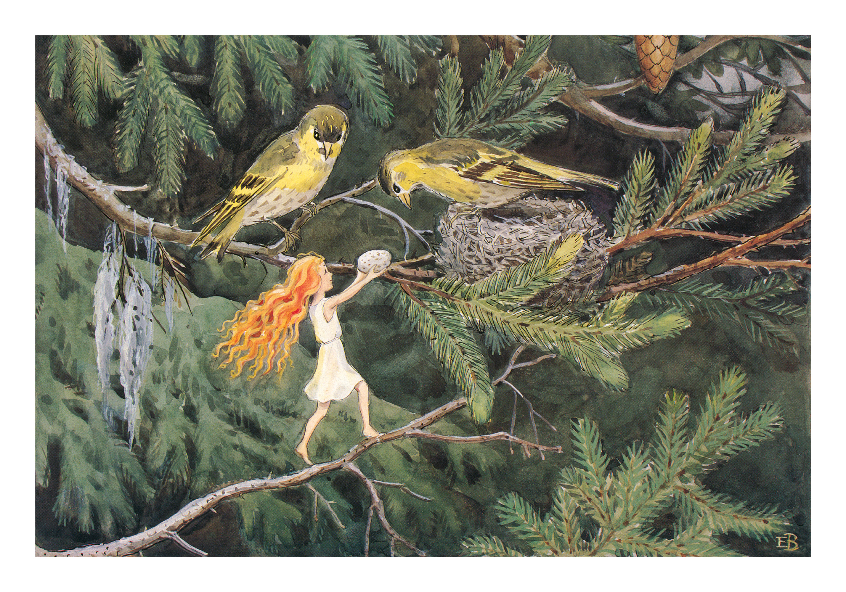 A print illustrating a small fairy with red hair and a white dress standing on a tree branch, holding an egg. Two yellow birds are nearby among green pine needles.