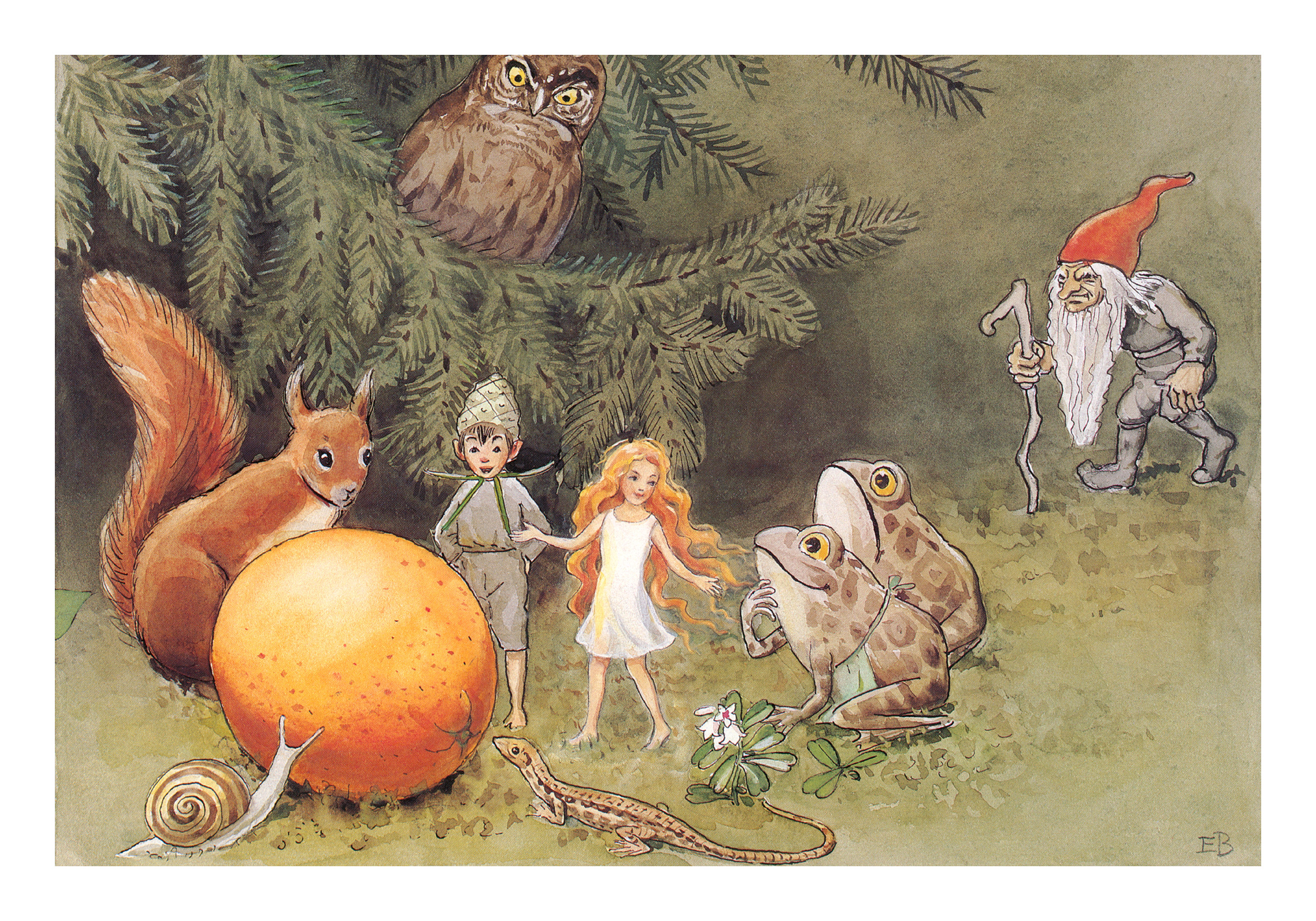 A whimsical print with a squirrel, a large orange fruit, a snail, fairy-like figures, frogs, a lizard, an owl, and a gnome with a red hat. Perfect wall art for a playful space.