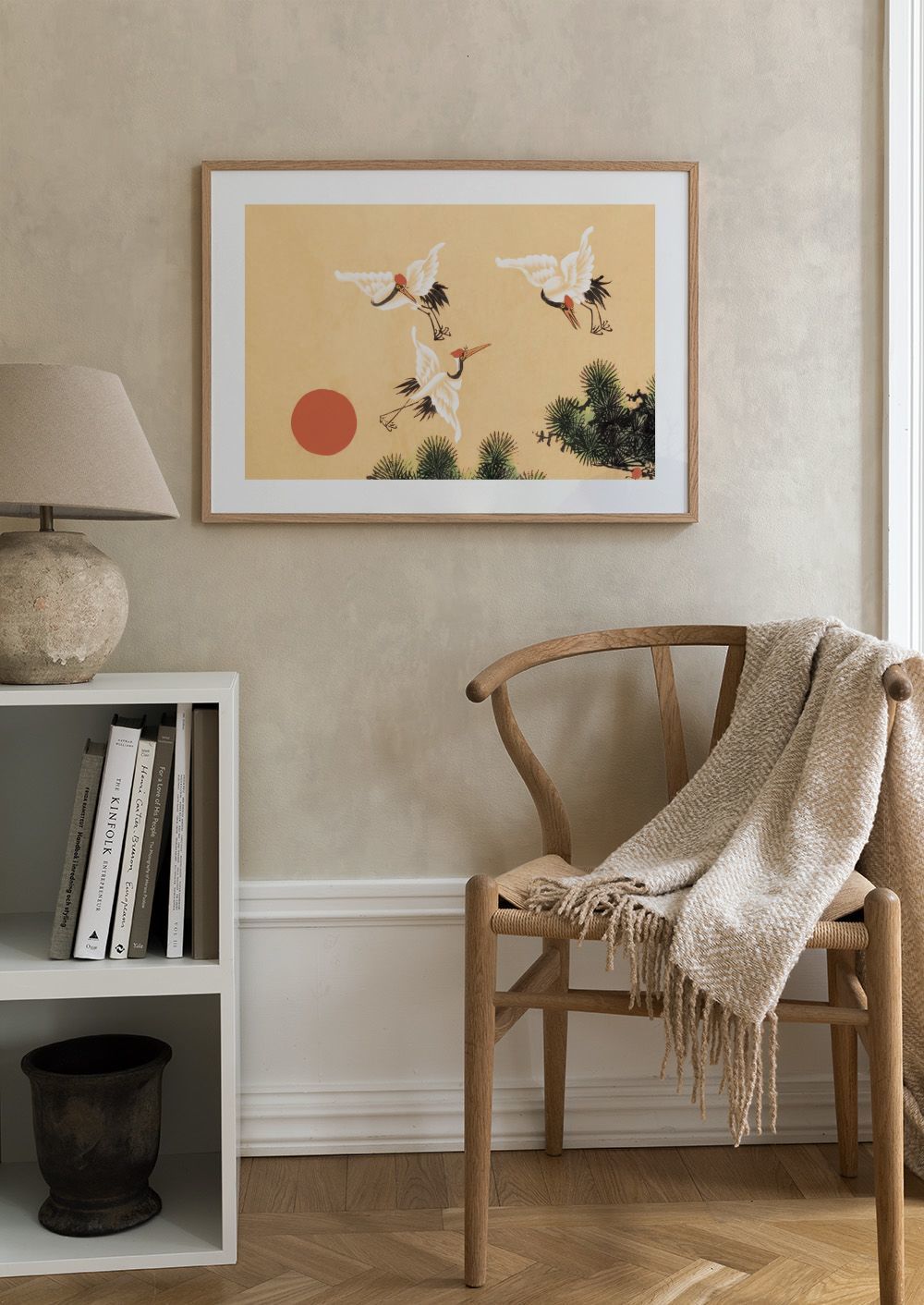 A print of three white cranes with black wings flying against a light tan background with a large red sun and green pine tree branches.