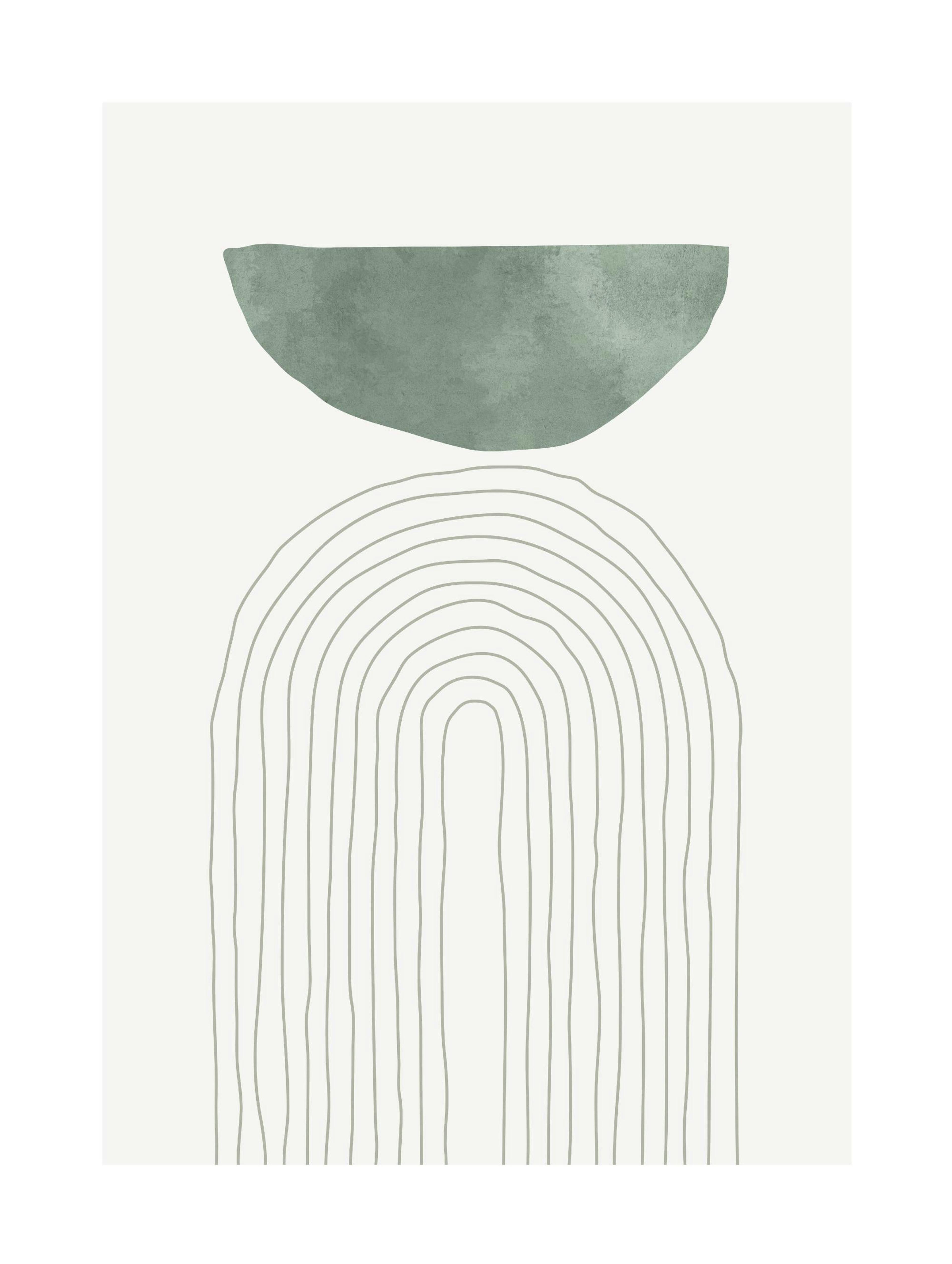A beautiful graphic illustration print of mint green lines forming an arc with a semicircle in green above. This art print, with its retro flair, adds fresh accents to your home and is great to combine with the 'Green Arch Illustration No2 print' or other abstract prints. Reflect your personality through graphic prints and make your home your favorite place.