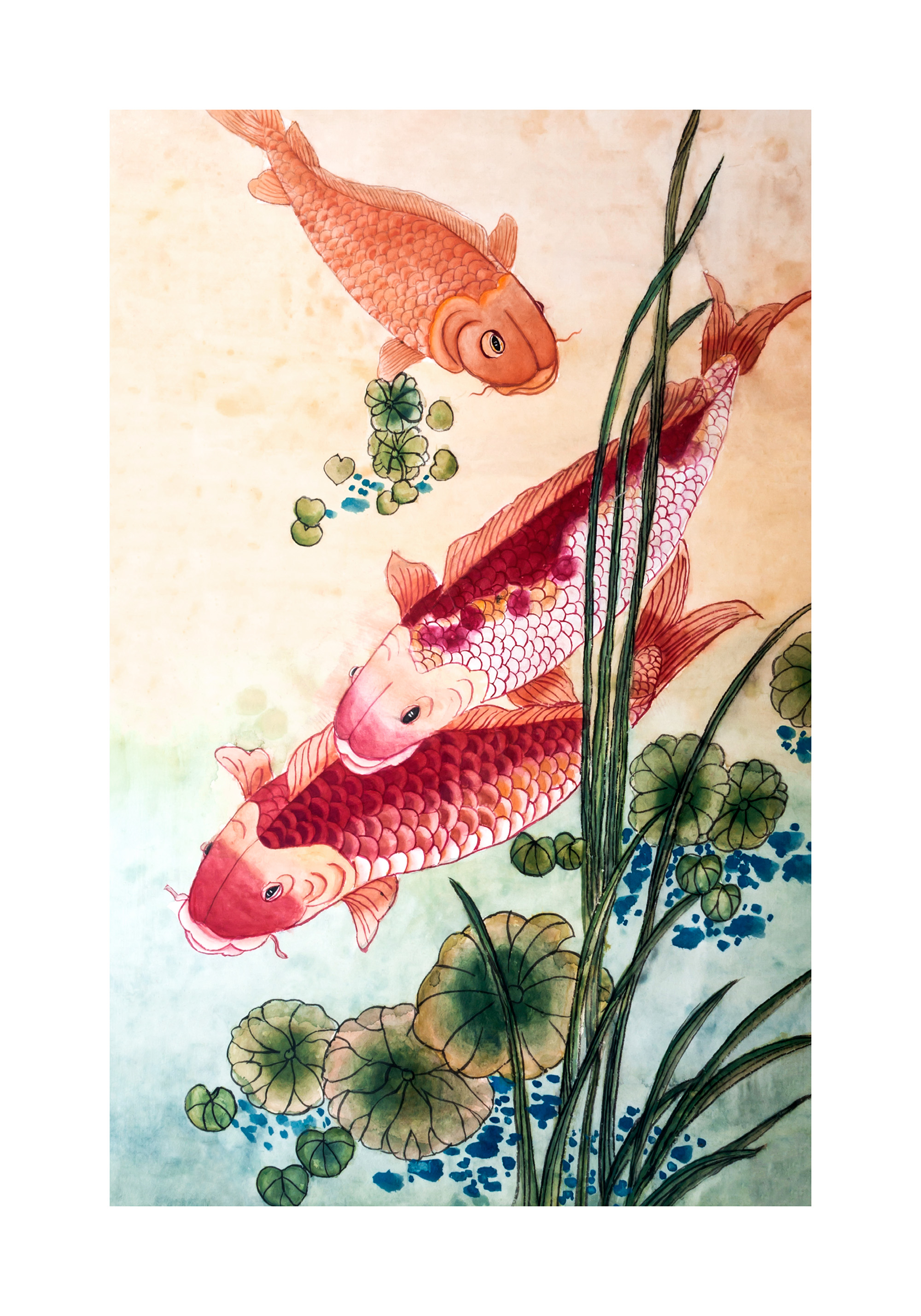 A print of three colourful koi fish swimming in water with green plants and reeds. The fish are orange and pink with beautiful scales.