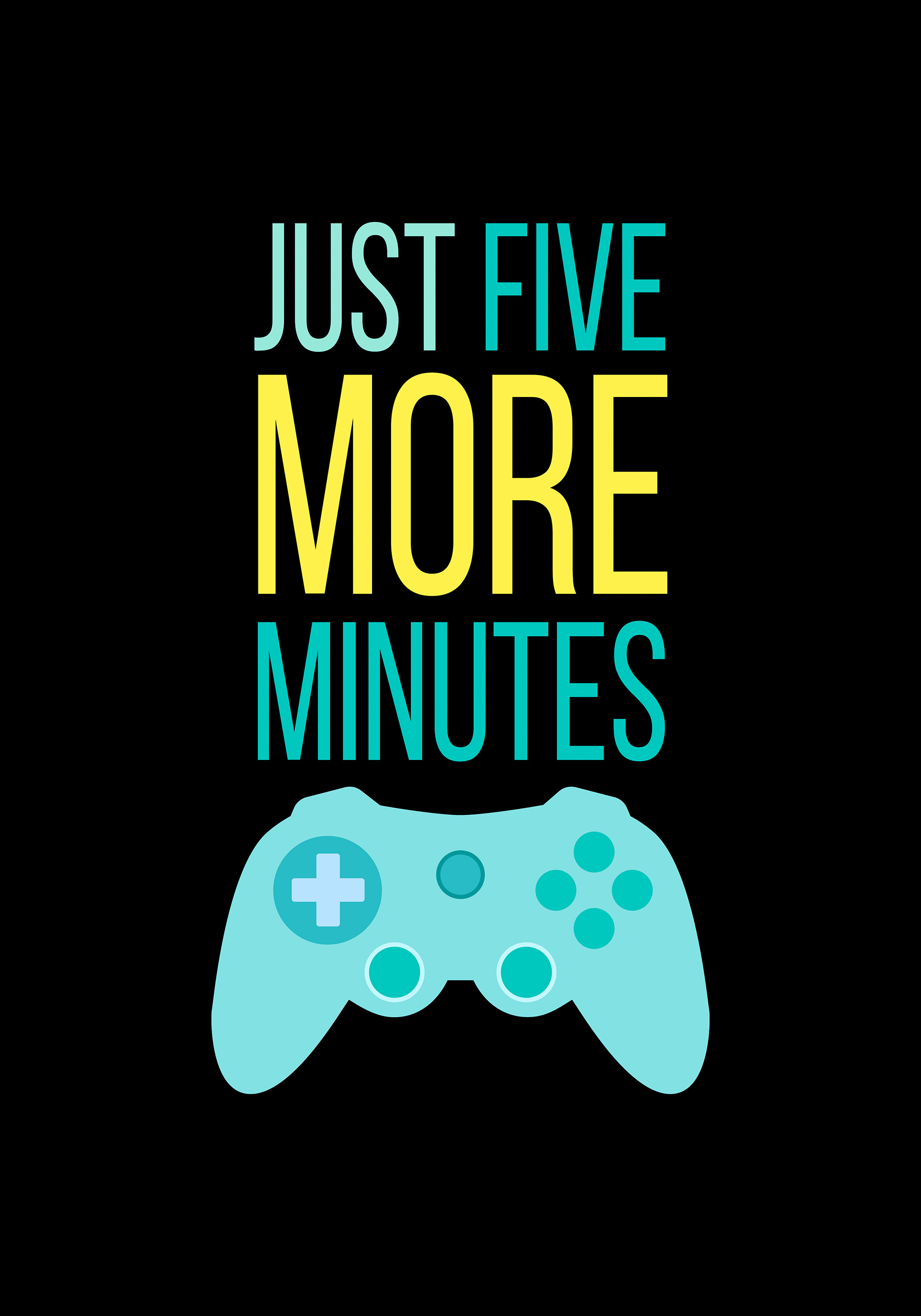A print with the text "Just Five More Minutes" in light blue, turquoise, and yellow on a black background, featuring a game controller below the text.