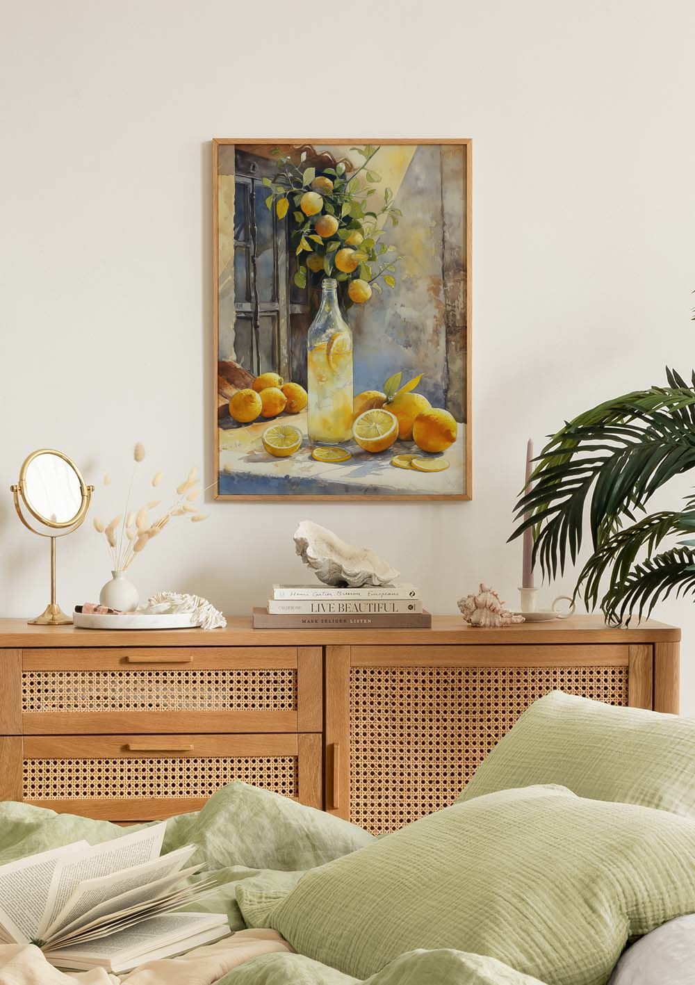 From $15.57A print of a glass bottle with lemon slices and lemonade on a table, surrounded by whole and cut lemons with yellow and green leaves. Perfect wall art for your kitchen.