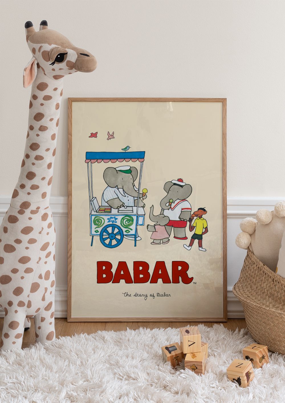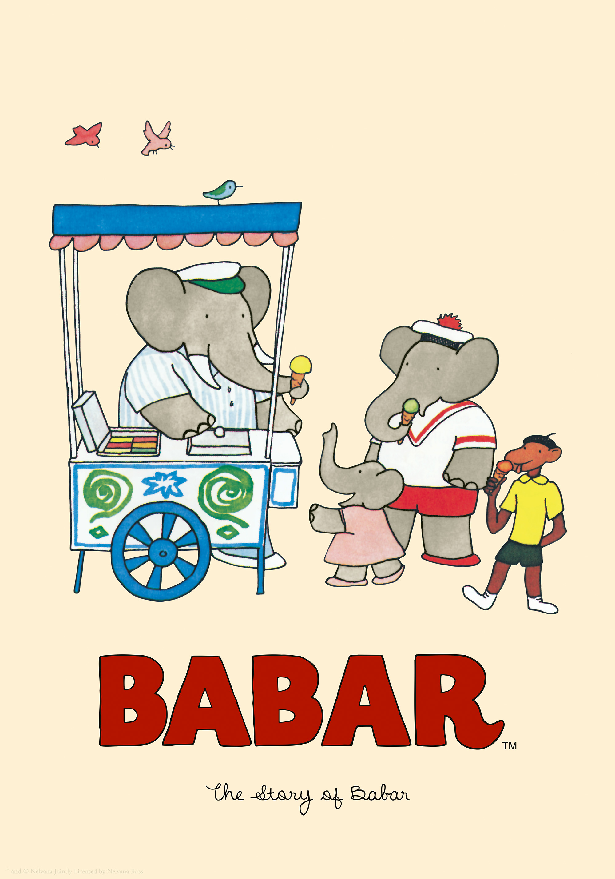 A colourful print of three elephants by an ice cream cart with a striped canopy. Perfect wall art for a child's room!