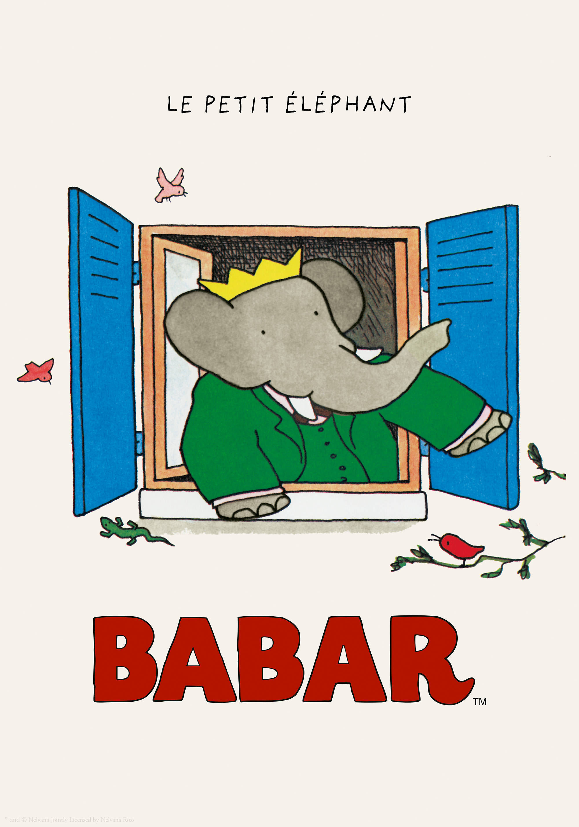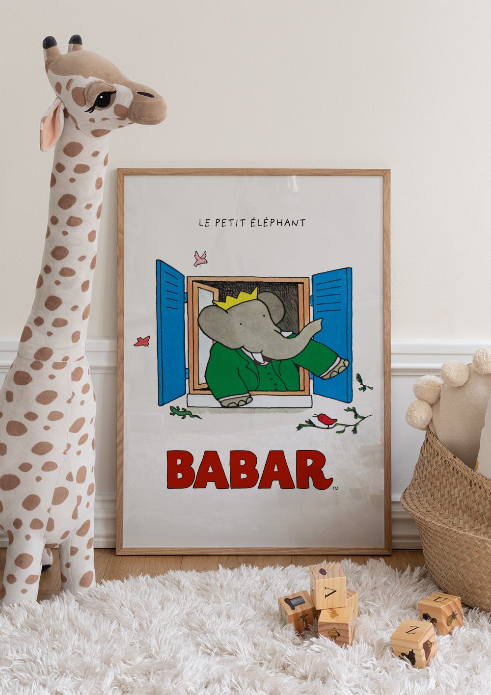 A print of an elephant wearing a crown and green suit, looking out of a window with blue shutters. The word "BABAR" is written in large red letters.