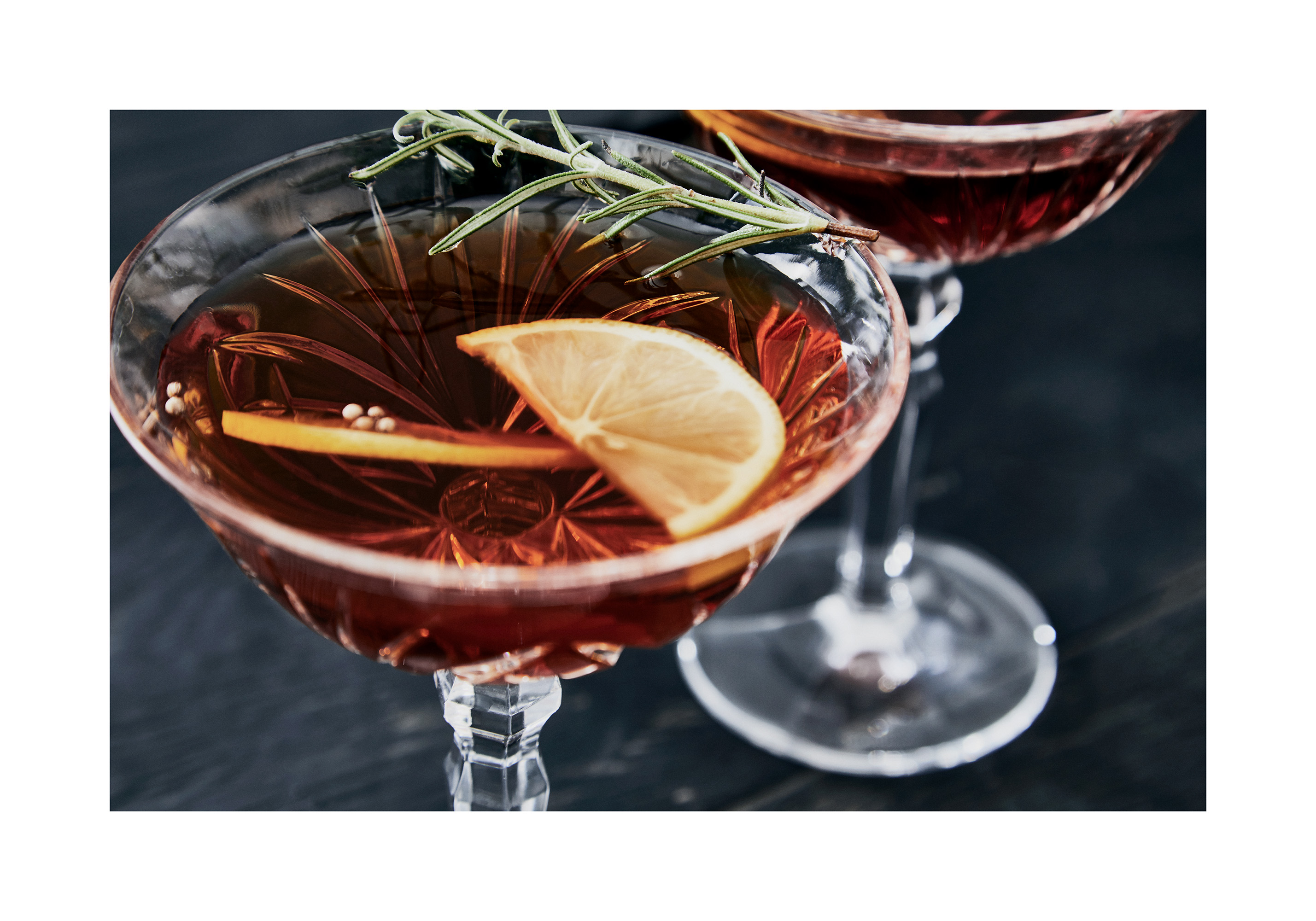 A print of two elegant glasses with dark red drinks, garnished with lemon slices and rosemary sprigs. Perfect wall art for your kitchen or dining room.