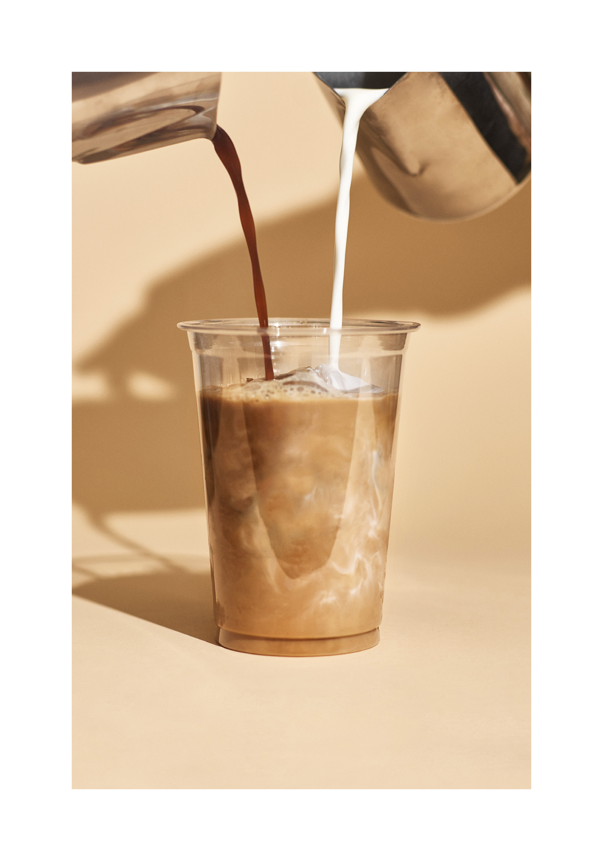 A print of coffee and milk being poured into a clear cup, creating a beautiful swirl of brown and cream colours on a beige background.