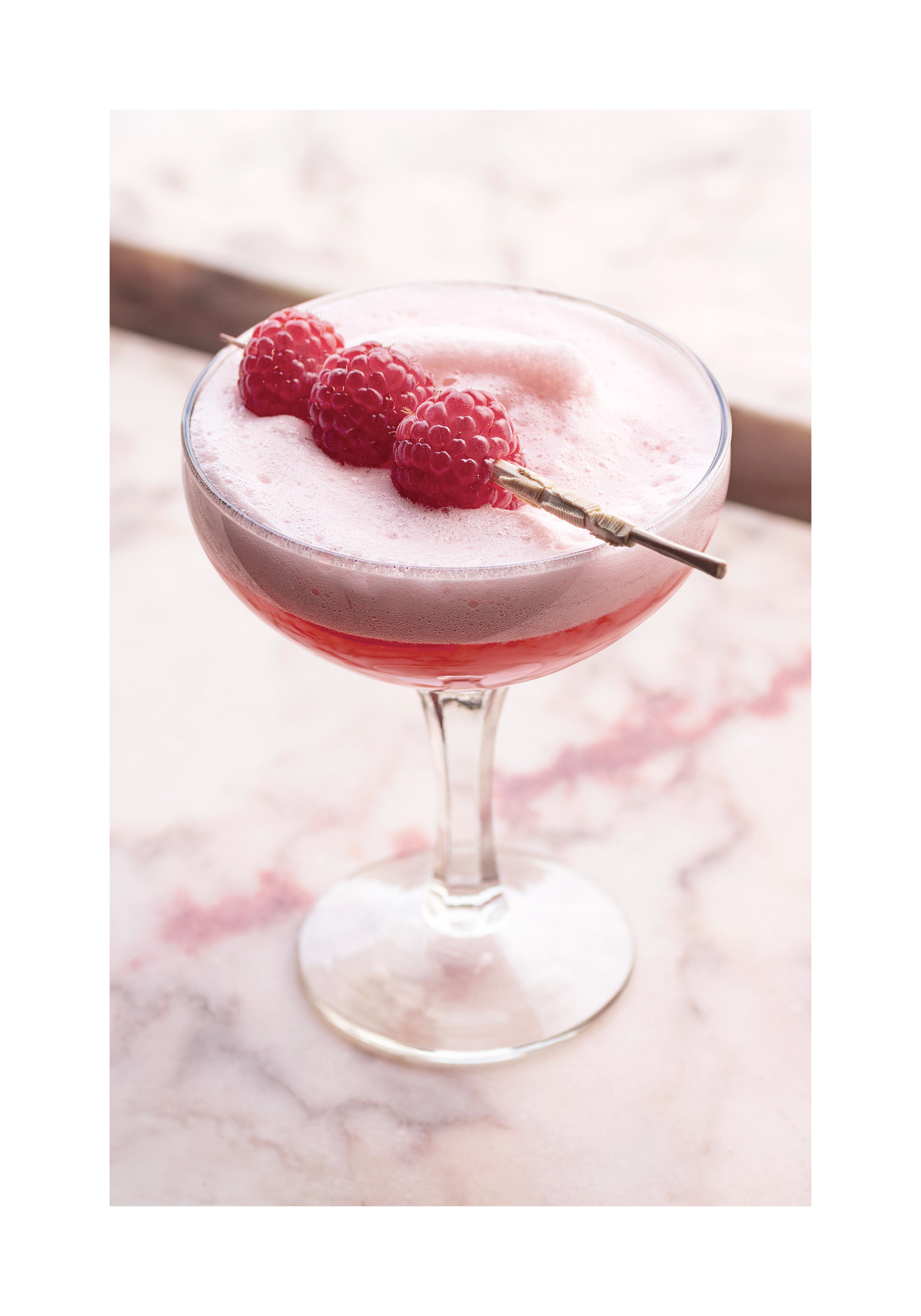 A print of a pink foamy cocktail in a glass with raspberries on top. The glass stands on a white and pink marble surface.