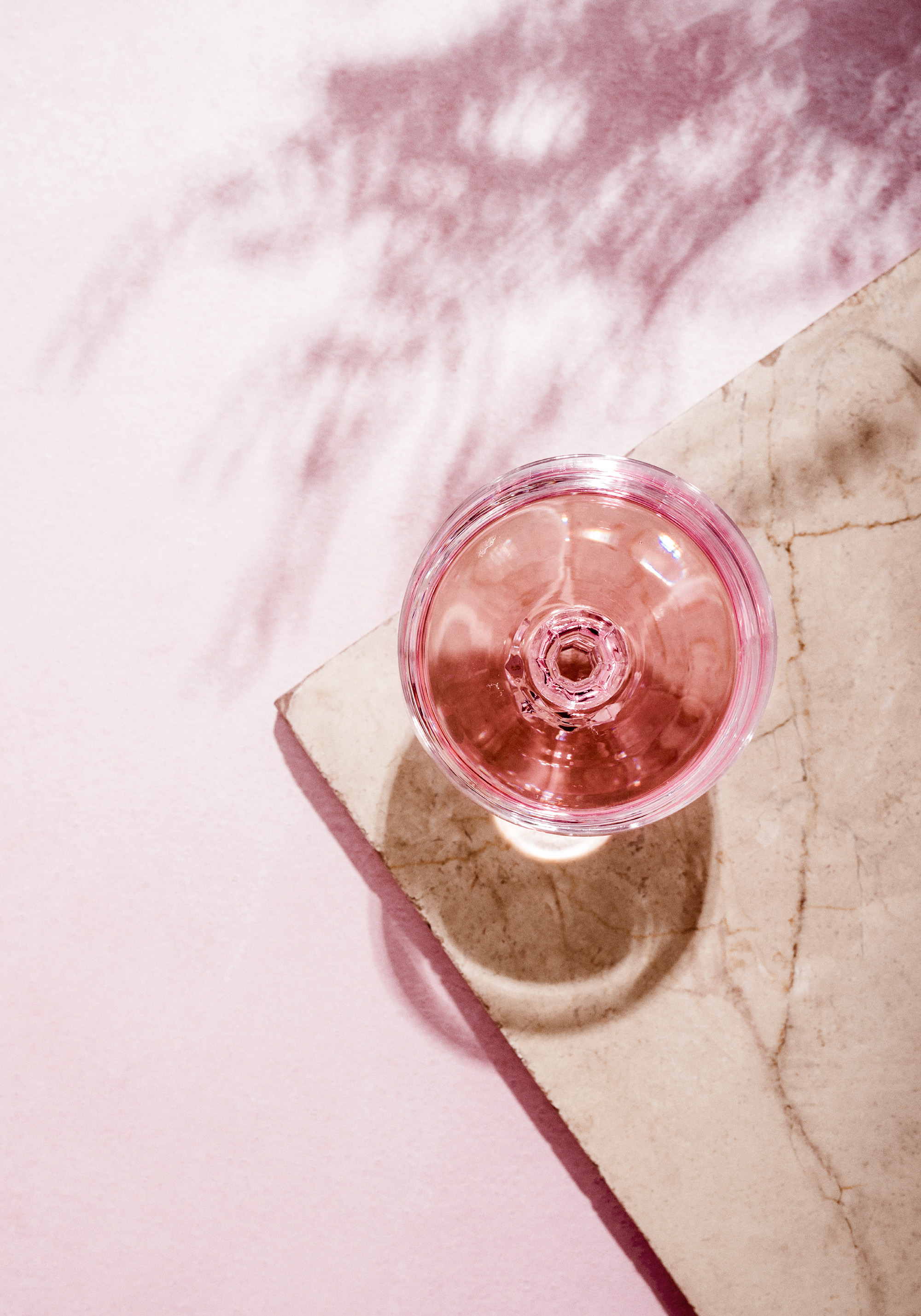 A print of a pink-tinted glass on a light beige marble surface with a pale pink background and soft shadows of leaves.