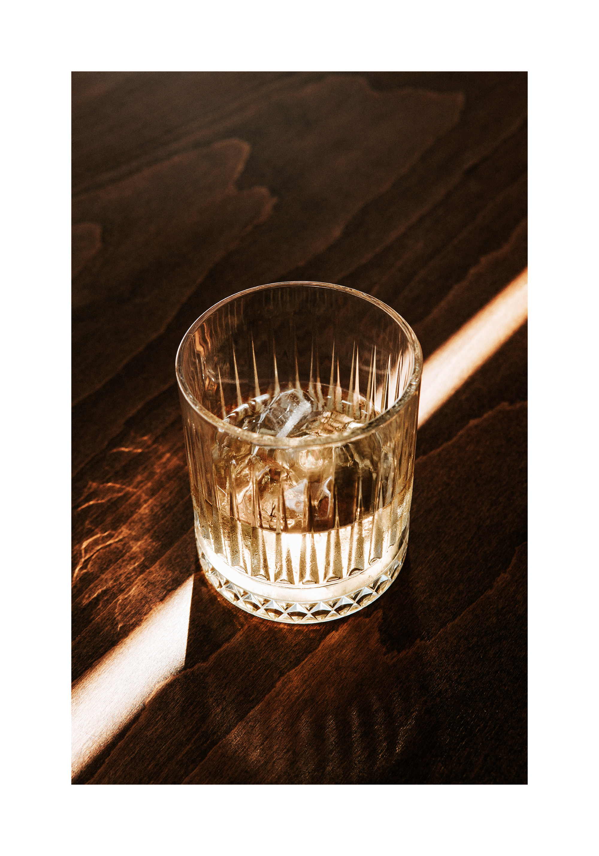 A print of a glass with ice and whisky on a wooden table. Sunlight creates beautiful reflections and shadows around the glass.