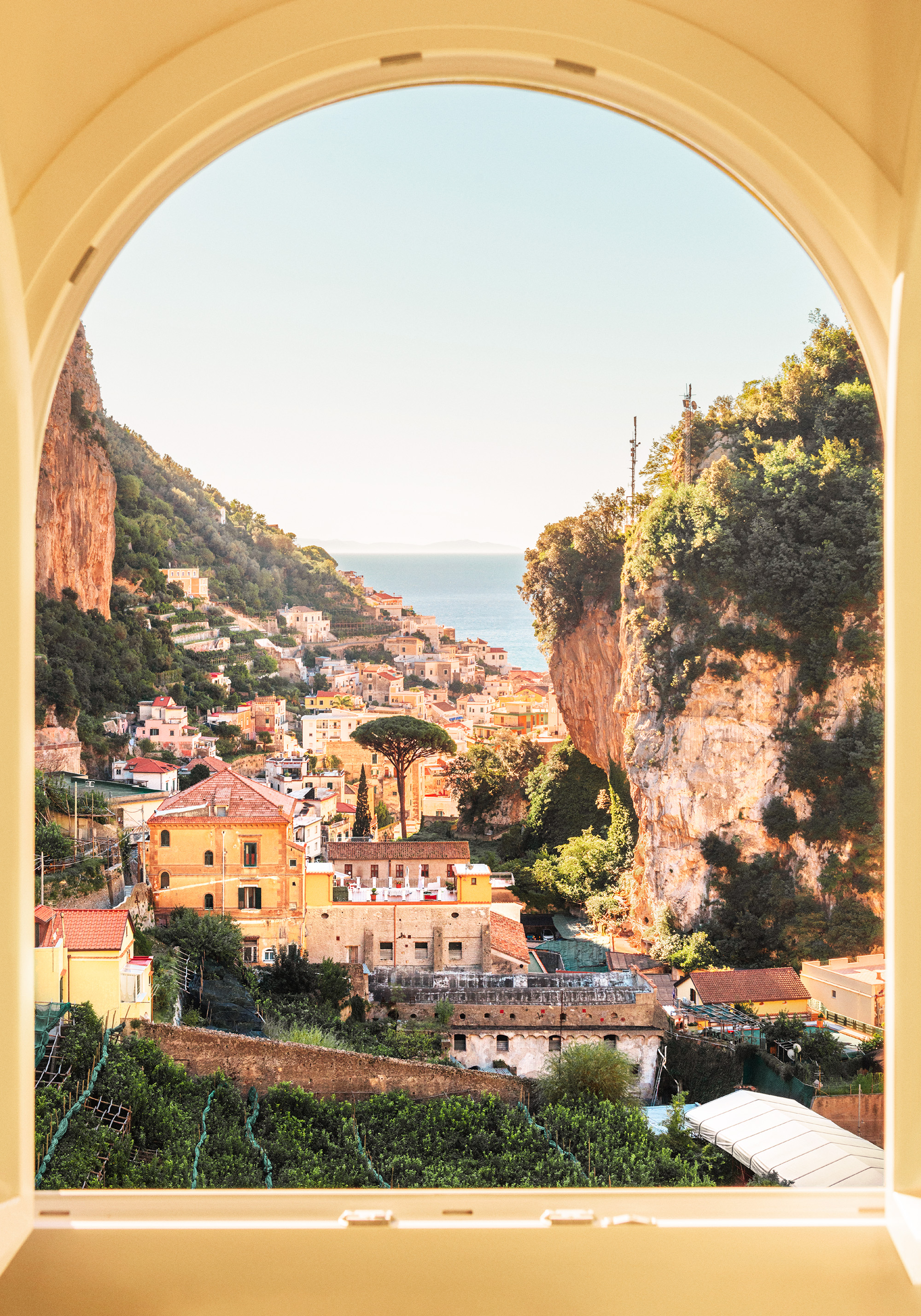 A print of a coastal town viewed through an arched window. Features warm yellow and orange buildings, green hills, and the blue sea in the background.