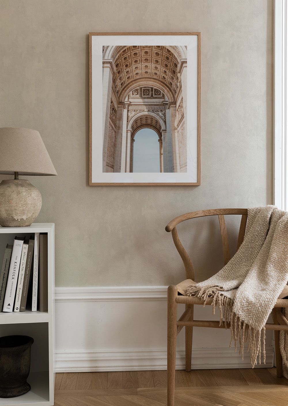 A print of a stone archway with detailed carvings and patterns. The ceiling features square designs with floral details in light beige stone.
