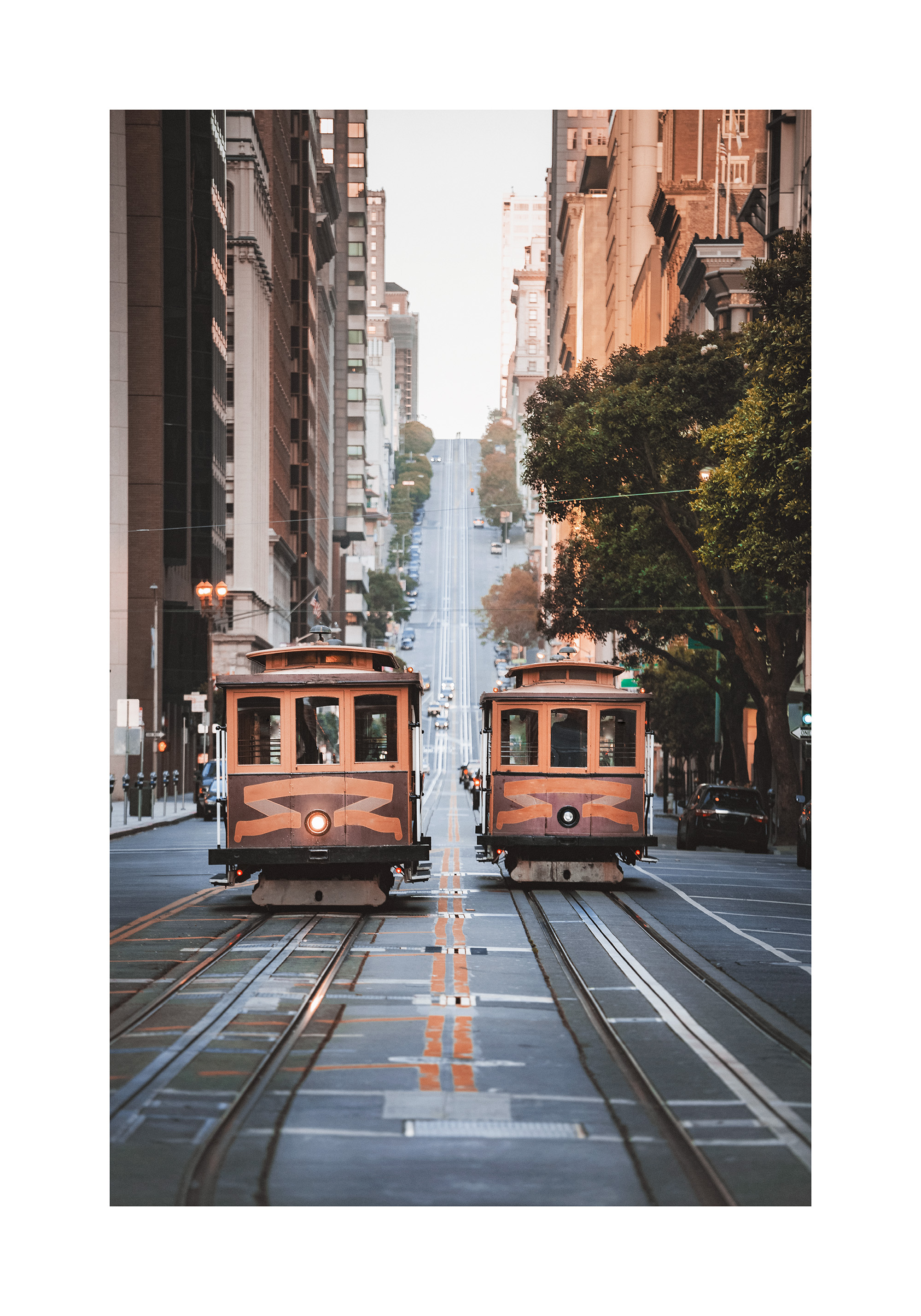A print of two vintage trams on parallel tracks in San Francisco. The trams are orange and cream, set against tall buildings and a steep street going uphill.