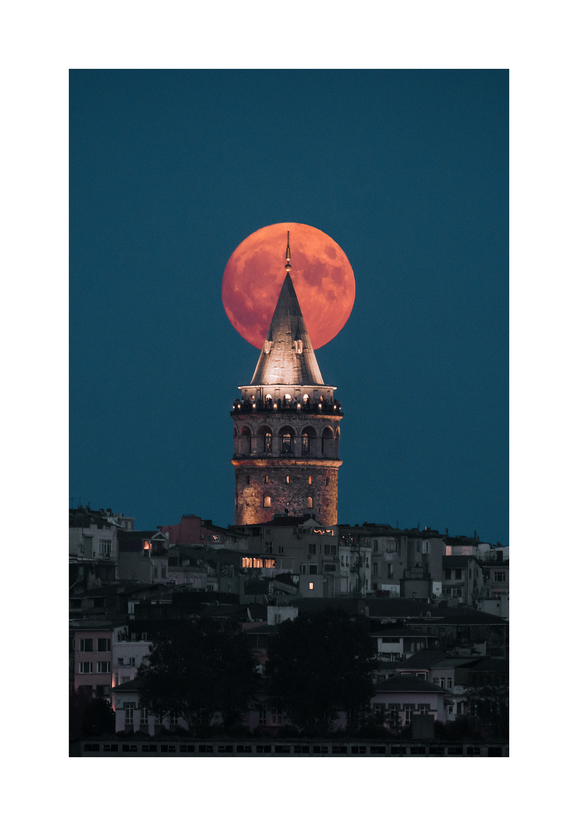 A print of a tall, pointed tower in Istanbul with a bright orange full moon behind it. The sky is deep blue and the tower is lit up with lights.