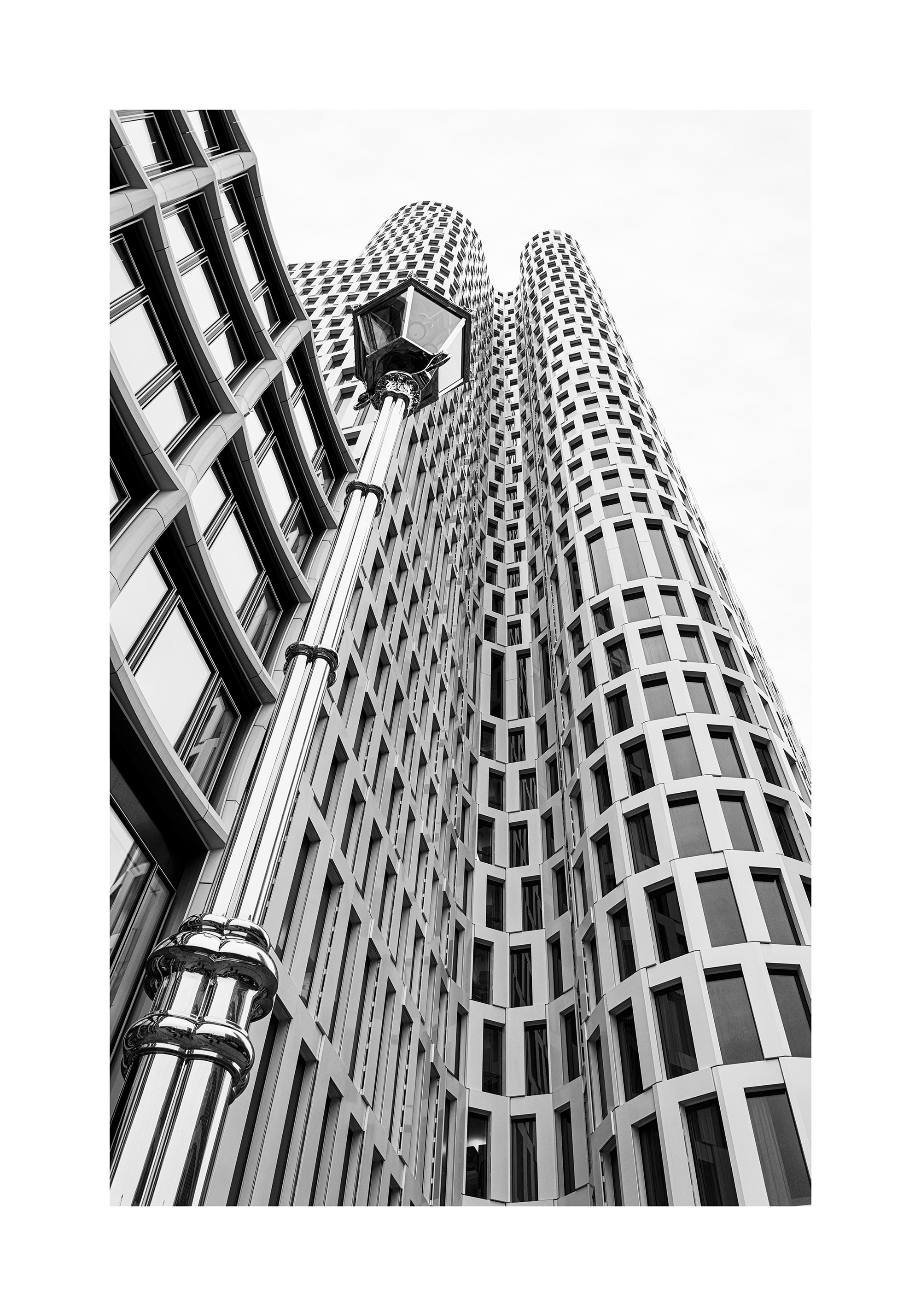 A black and white print of a tall skyscraper with a wavy design and rectangular windows. A street lamp is shown in the foreground.