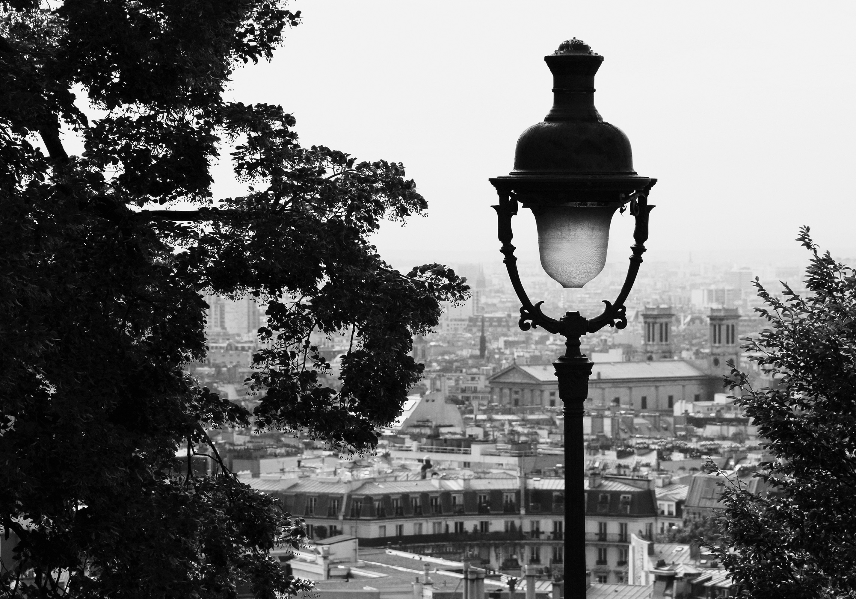 A black and white print of a street lamp with tree branches and a cityscape in the background.