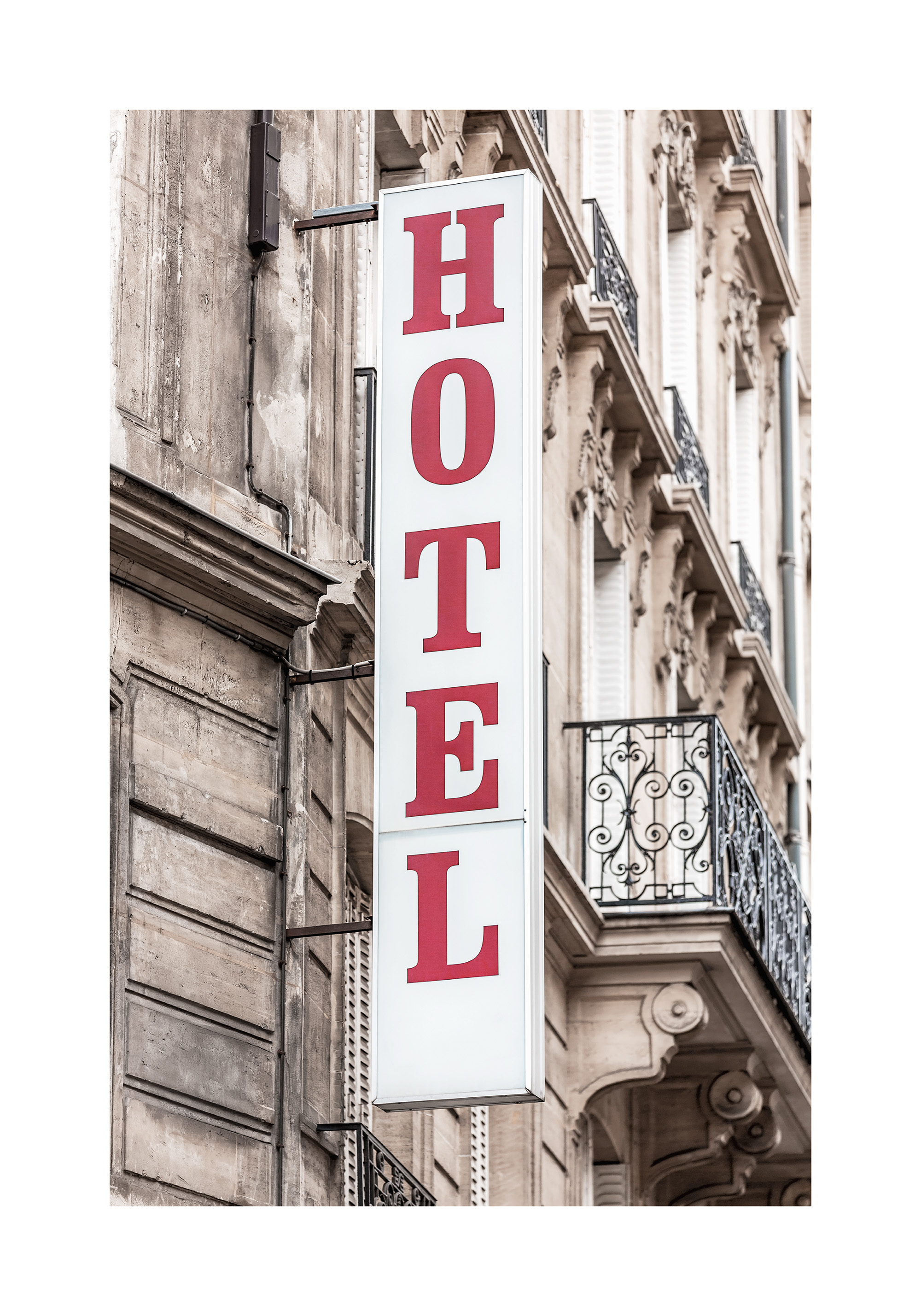 A print of a red hotel sign on an old building with beige stone walls and black metal railings. Perfect wall art to add a classic touch to your home.
