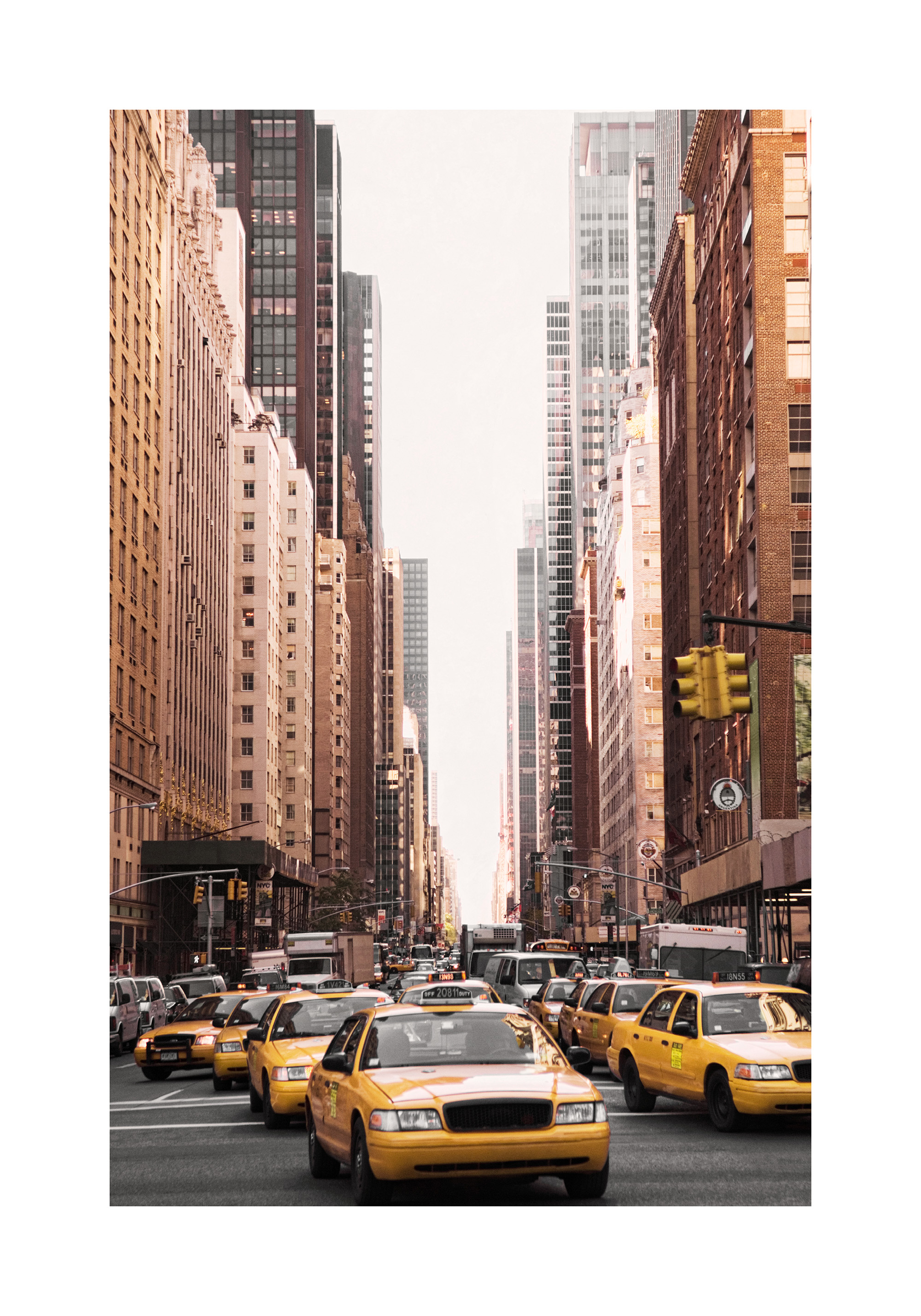 A print of a busy city street in New York lined with tall brown and beige buildings. Yellow taxis fill the road beneath a bright sky.