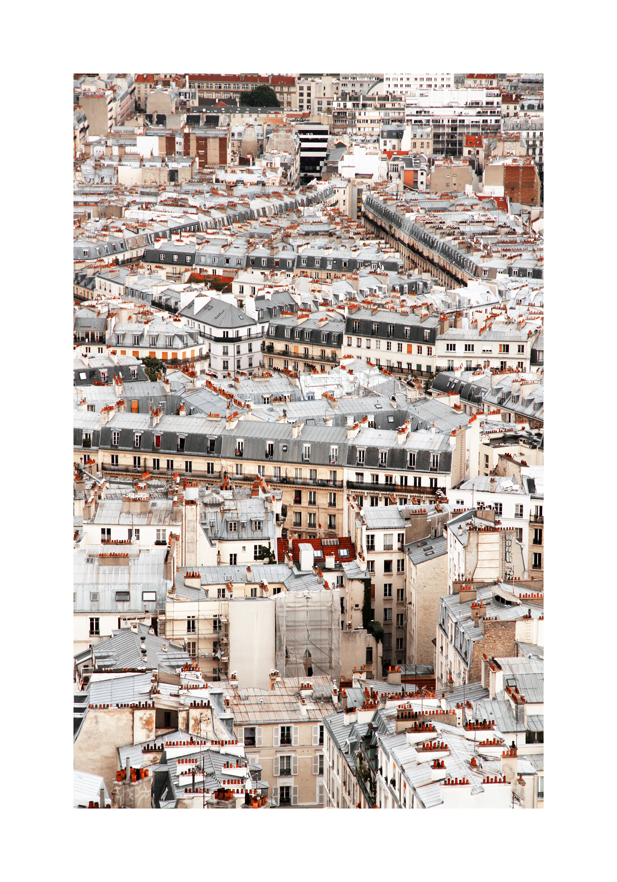 A print showing an aerial view of a city with beige buildings, grey rooftops, and red chimneys.