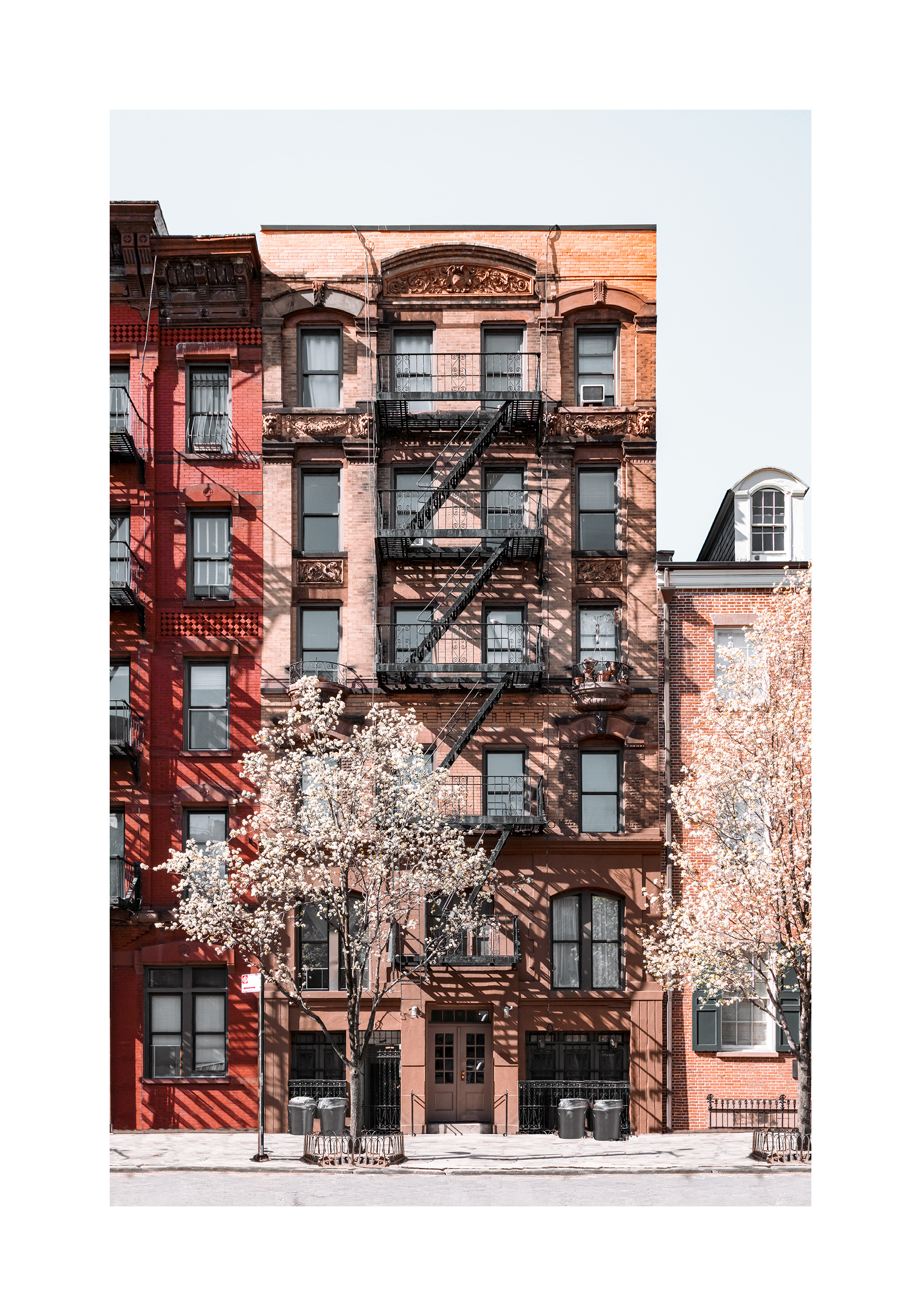 A print of brick buildings with fire escapes and blooming pink trees in front. Perfect wall art to bring a spring vibe to your home.