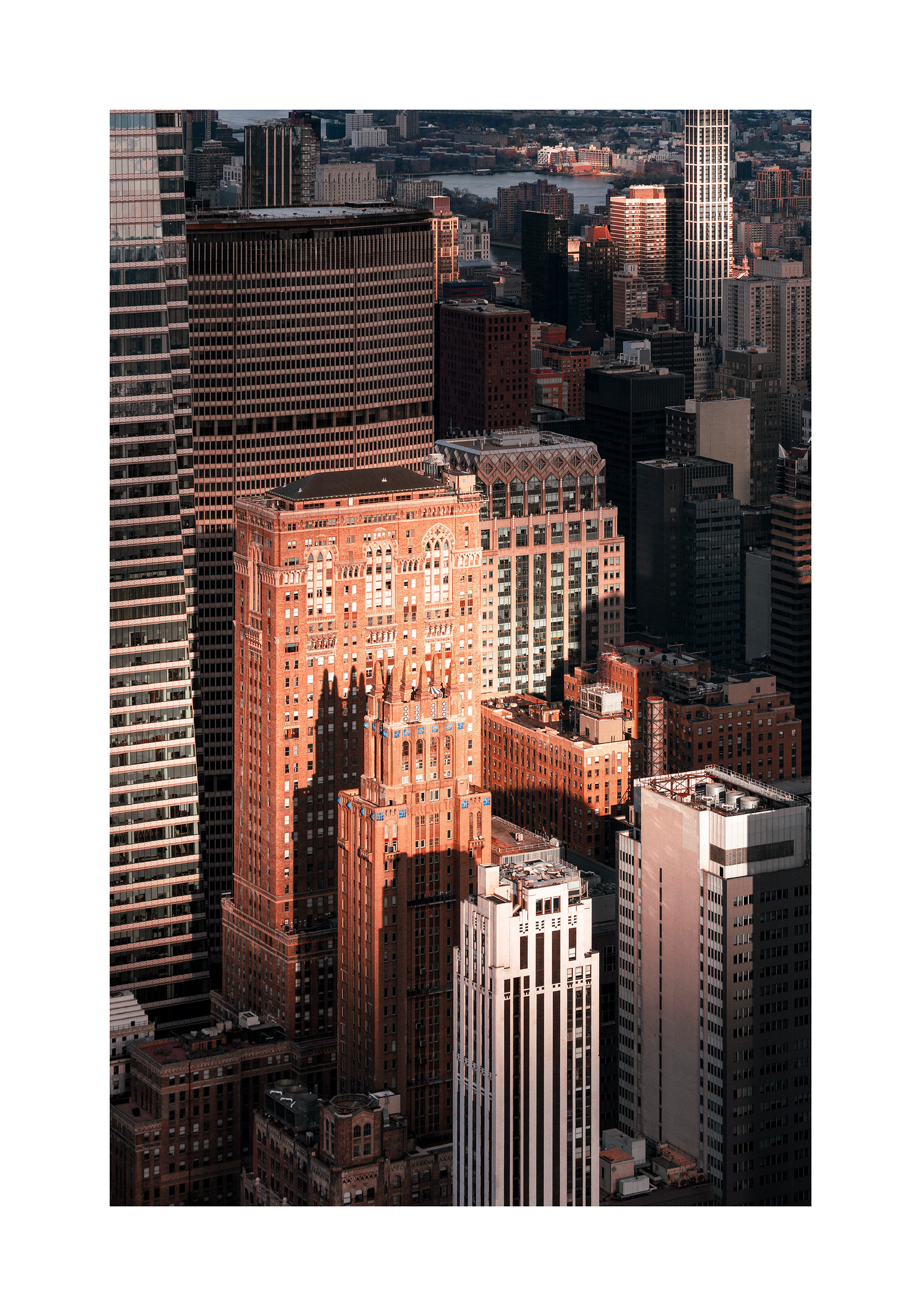 A print of tall buildings in New York City. The photo features rectangular buildings with windows in shades of brown, white, and grey. Perfect wall art to bring an urban vibe to your home.