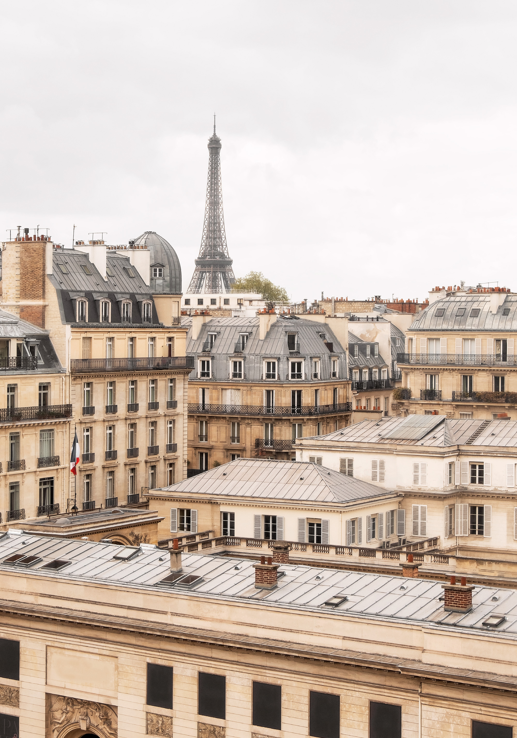 A print of Paris rooftops with the Eiffel Tower in the background. The print shows beige buildings with grey roofs under a cloudy sky.